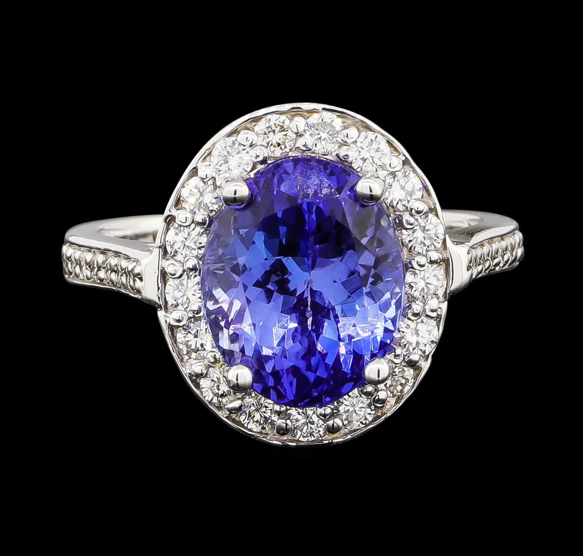 One electronically tested 14KT white gold lady's cast fashion ring with a cathedral shank with a basket halo with a bright polish finish. The featured lady's ring has a shank measuring 2.66 millimeters wide. Identified with markings of '14K'. Condition is new, good workmanship. Containing: One prong set oval modified brilliant cut natural tanzanite, measuring 11.00 x 8.93 x 7.11mm, (depth est.) approximate weight of 4.98ct., clarity is eye clean, medium dark, moderately strong, violetish blue color, (GIA vB 6/4), cut is very good. Transmitting light with no distortion, transparent. Colored gemstones are presumed to have been subjected to commonly used enhancement processes. Seventeen prong set round brilliant cut diamonds, measuring 1.95 - 1.85 x 1.18mm (depth est.) approximate total weight of 17 Stones = 0.44ct. Graded in the setting. Clarity SI-1 to SI-2. Color: H - I Cut Good Sixteen prong set round brilliant cut diamonds, measuring 1.40 - 1.35 x 0.86mm (depth est.) approximate total weight of 16 Stones = 0.16ct. Graded in the setting. Clarity SI-1 to SI-2. Color: H - I Cut Good. Total Weight of Colored Stones 4.98ct.. Total Weight of Diamonds 0.60ct.. Total Weight of Ring 6.50gm. GAS Appraised at $9,420.00.