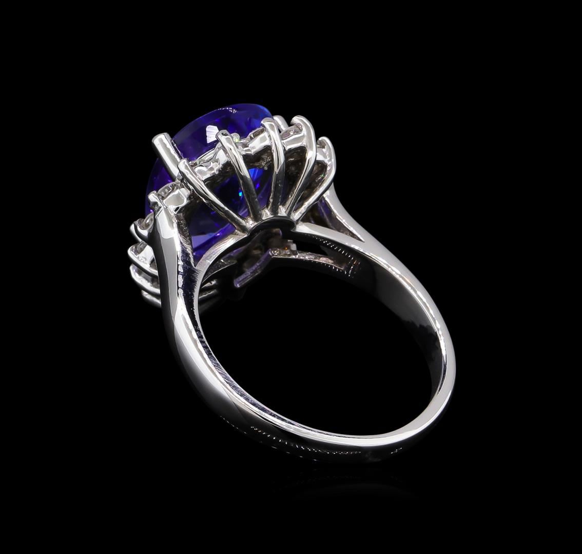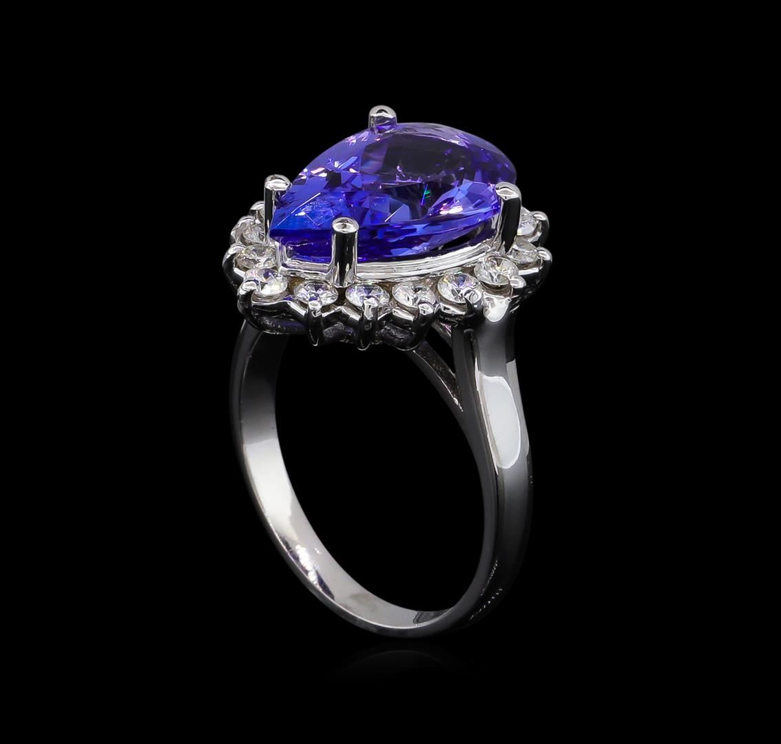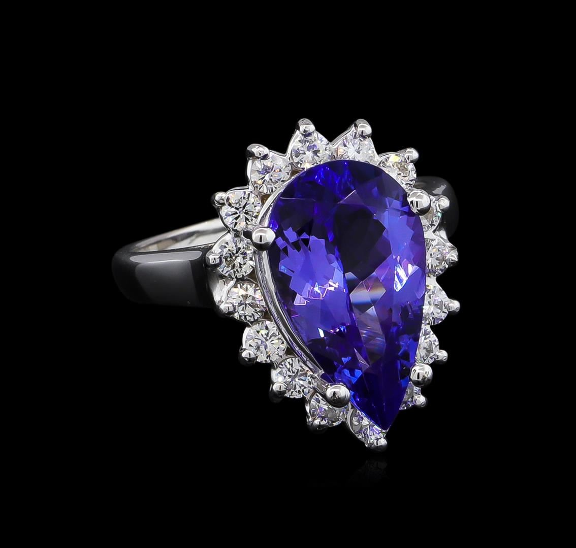 One electronically tested 14KT white gold ladies cast tanzanite and diamond ring with a bright polish finish. The featured tanzanite is set within a diamond floret supported by a ribbed under gallery, completed by a two millimeter wide band. Identified with markings of "14K". Condition is new, good workmanship. Containing: One prong set pear mixed cut natural tanzanite, measuring 15.30 x 8.90 x 5.70mm, approximate weight of 4.98ct., clarity is eye clean, type I, medium dark, very slightly grayish, bluish violet color, (GIA bV 6/3), cut is good. Transmitting light with no distortion, transparent. Graded in the setting. Tanzanite is a very rare gemstone that is only found in the country of Tanzania. Originally discovered in 1967. Tiffany & Company, named the stone Tanzanite. It is found in the Usumburu Mountains that border the Umba Valley of northern Tanzania. Tanzanite occurs in gray, brown, violet, blue, reddish-purple, & green. The gem is interesting because of its exceptional pleochroism. Rotated in different directions a tanzanite will exhibit multiple changes of color. Tanzanite has a low tolerance to ultrasonic cleaning, and should not be cleaned using this method. Sixteen prong set round brilliant cut diamonds approximate. Total Weight of 16 Stones = 0.65ct. Graded in the setting. Clarity: SI-1 to SI-2. Color: E - G. Total Weight of Colored Stones 4.98ct. Total Weight of Diamonds 0.65ct. Total Weight of Ring 6.69gm. AIG Appraised at $14,260.00.