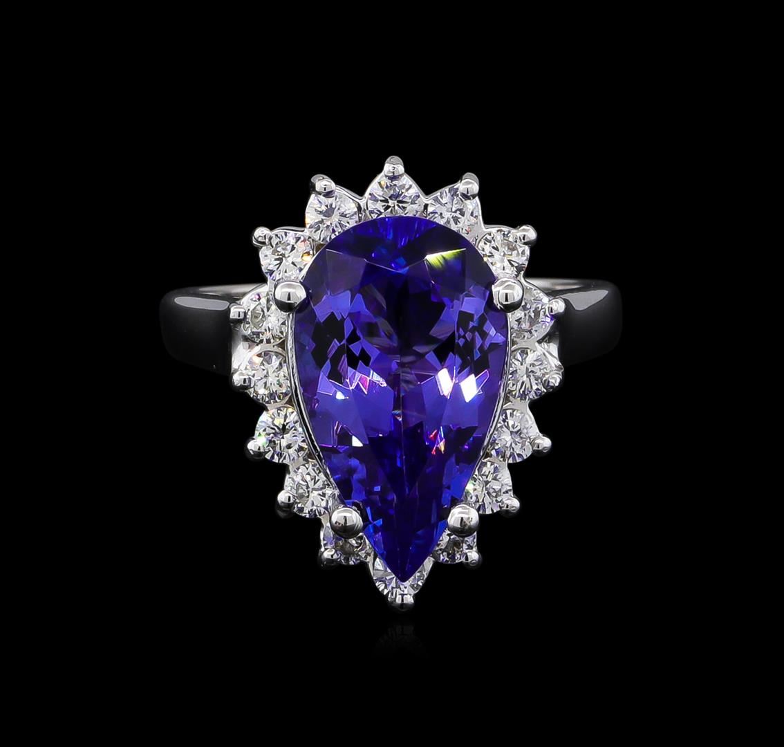 One electronically tested 14KT white gold ladies cast tanzanite and diamond ring with a bright polish finish. The featured tanzanite is set within a diamond floret supported by a ribbed under gallery, completed by a two millimeter wide band. Identified with markings of "14K". Condition is new, good workmanship. Containing: One prong set pear mixed cut natural tanzanite, measuring 15.30 x 8.90 x 5.70mm, approximate weight of 4.98ct., clarity is eye clean, type I, medium dark, very slightly grayish, bluish violet color, (GIA bV 6/3), cut is good. Transmitting light with no distortion, transparent. Graded in the setting. Tanzanite is a very rare gemstone that is only found in the country of Tanzania. Originally discovered in 1967. Tiffany & Company, named the stone Tanzanite. It is found in the Usumburu Mountains that border the Umba Valley of northern Tanzania. Tanzanite occurs in gray, brown, violet, blue, reddish-purple, & green. The gem is interesting because of its exceptional pleochroism. Rotated in different directions a tanzanite will exhibit multiple changes of color. Tanzanite has a low tolerance to ultrasonic cleaning, and should not be cleaned using this method. Sixteen prong set round brilliant cut diamonds approximate. Total Weight of 16 Stones = 0.65ct. Graded in the setting. Clarity: SI-1 to SI-2. Color: E - G. Total Weight of Colored Stones 4.98ct. Total Weight of Diamonds 0.65ct. Total Weight of Ring 6.69gm. AIG Appraised at $14,260.00.