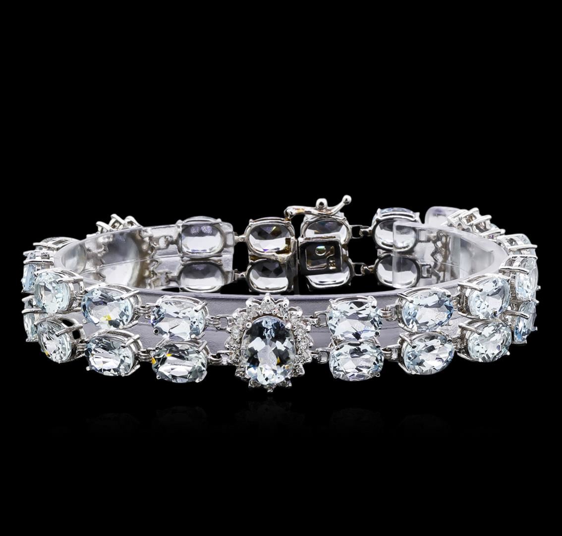 One 14KT white gold 40.00ctw aquamarine and diamond bracelet. Metal: 14KT solid white gold. Face Measurements: 15 x 195mm. Size: 7.5. Finish: Bright polish. Total Item Weight: 26.5 grams. Markings: Stamped 14K. Country Made: USA. Containing: 3 oval Aquamarines with a total weight of 6.50ct. Measuring: 8 x 10mm. Color: Aqua. Treatment: None. Setting: Prong. Hue: Aqua blue. Saturation: Moderately strong. Tone: Medium dark. Clarity: Type 2. Cut: Very good. Also containing 28 oval Aquamarines with a total weight of 33.50ct. Measuring: 6 x 8mm. Color: Aqua. Treatment: None. Setting: Prong. Hue: Aqua blue. Saturation: Moderately strong. Tone: Medium dark. Clarity: Type 2. Cut: Very good. The aquamarines are complemented by 48 round Diamonds with a total weight of 1.85ct. Measuring: 1.3 - 1.5mm. Treatment: None. Setting: Prong. Color Grade: H - I. Clarity: SI1 - SI2. Cut: Very good. Excellent workmanship. Gemstones graded in the setting. BHGL Appraised at $16,500.00.