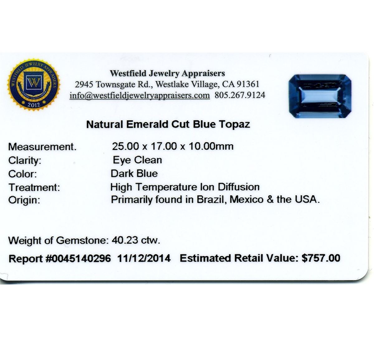 40.23ctw. Natural Emerald Cut Blue Topaz. Westfield Appraised at $757.00.