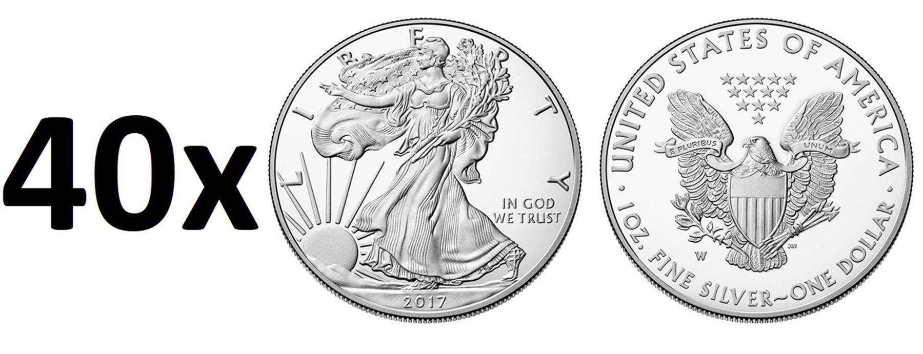One (40 COUNT) 2017 American Silver Eagle .999 Fine Silver Dollar Coins.