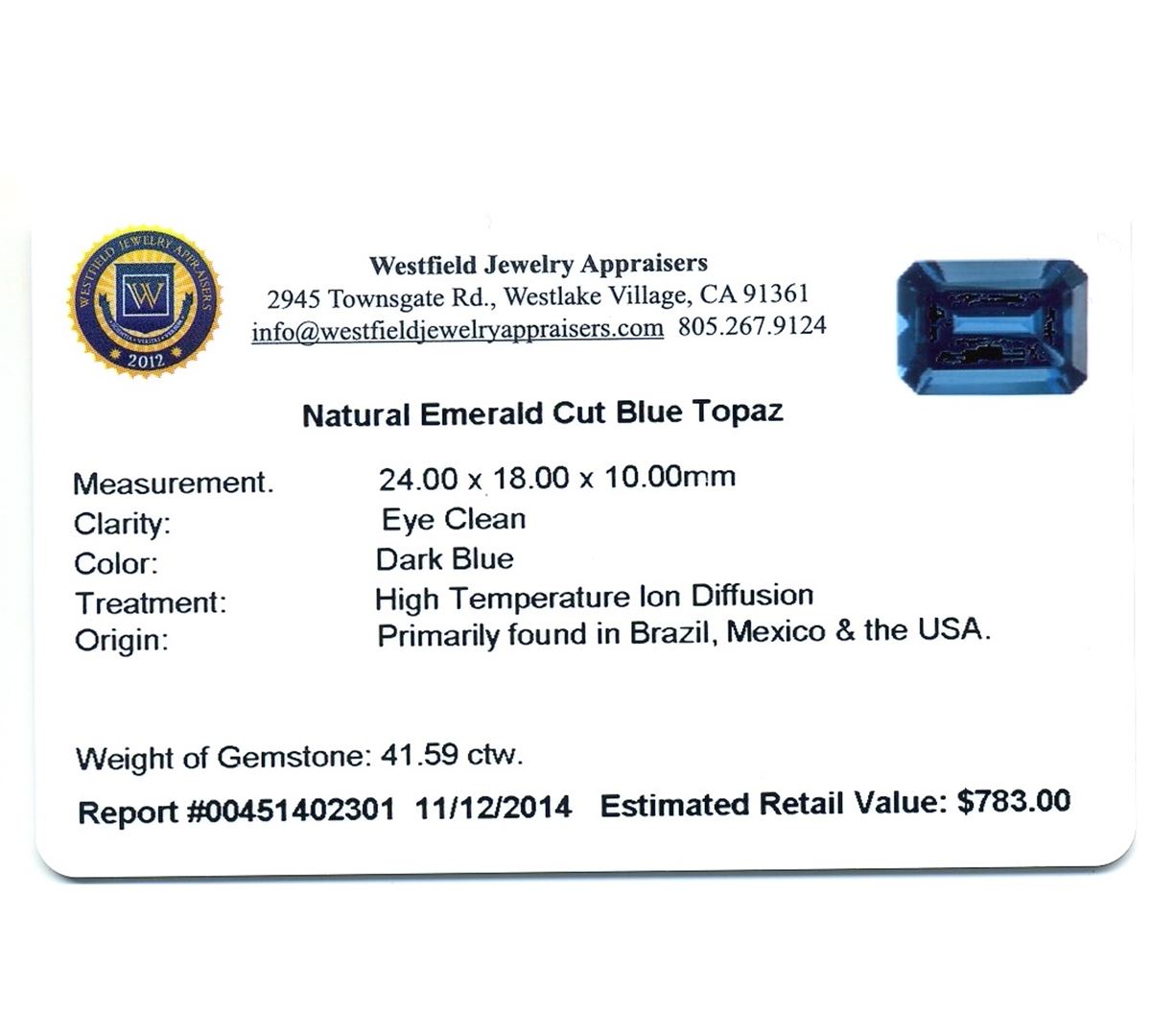 41.59ctw. Natural Emerald Cut Blue Topaz. Westfield Appraised at $783.00.