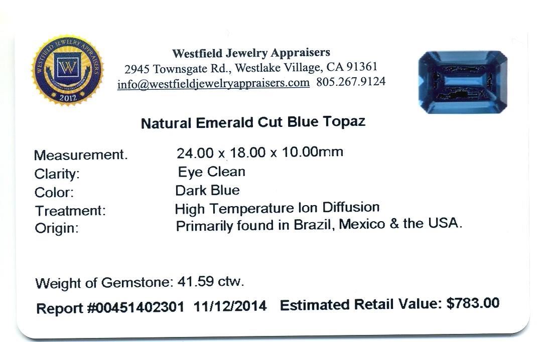 41.59ctw. Natural Emerald Cut Blue Topaz. Westfield Appraised at $783.00.