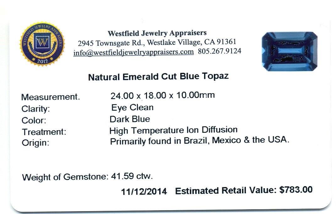 41.59ctw. Natural Emerald Cut Blue Topaz. Westfield Appraised at $783.00.