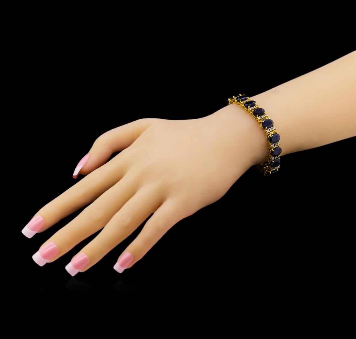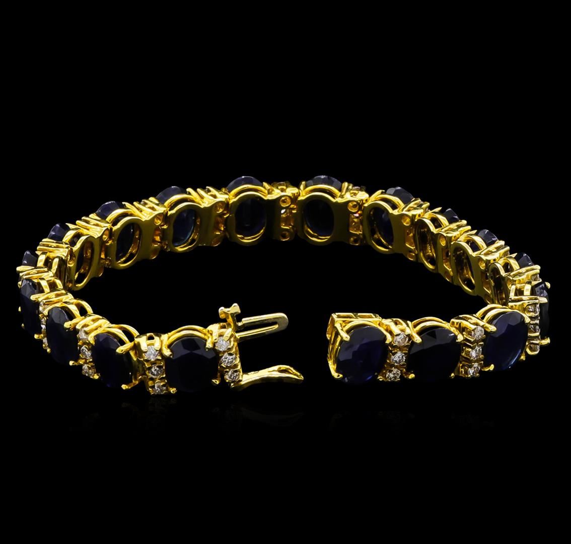 One electronically tested 14KT yellow gold ladies cast & assembled sapphire and diamond bracelet with a bright polish finish. Condition is good. Seven and one-quarter inch length bracelet features a flexible sapphire and diamond ribbon, terminating in a concealed clasp with safety. Identified with markings of "14K". Containing: Eighteen prong set oval mixed cut natural blue sapphires, measuring 9.00 x 7.00 x 4.40mm, approximate total weight of 42.04ct., clarity is heavily included, type II, dark, very slightly grayish, blue color, (GIA B 7/3), cut is good. Transmitting light somewhat diffusely, transparent to translucent. Naturally occurring internal & external characteristics are present. Measurements & the color grade are an average for the group. Graded in the setting. Fifty-four prong set round brilliant cut diamonds, measuring 2.10 - 2.00 x 1.23mm (depth est.) approximate total weight of 54 Stones = 1.80ct. Graded in the setting. Clarity: I-1 to I-2. Color: F - H. Total Weight of Colored Stones 42.04ct. Total Weight of Diamonds 1.80ct. Total Weight of Bracelet 32.38 grams. AIG Appraised at $23,435.00.