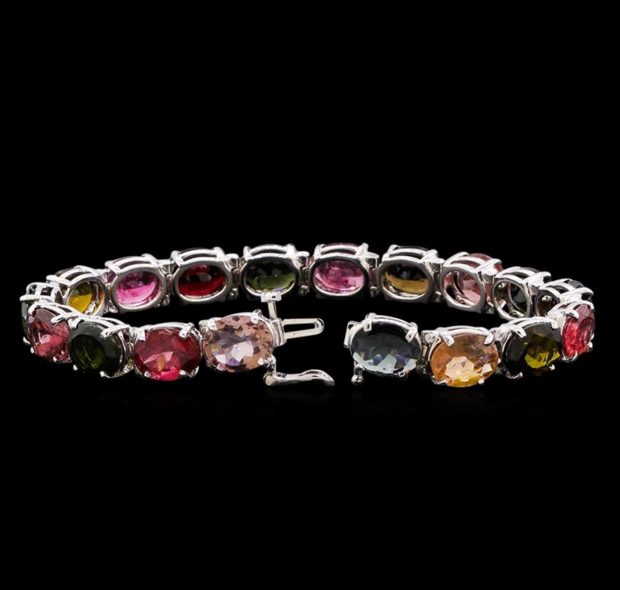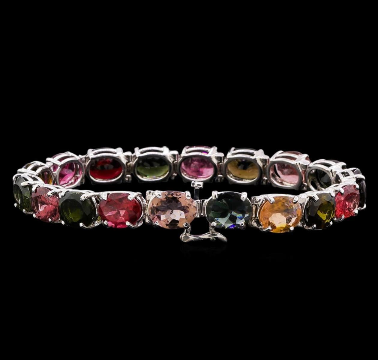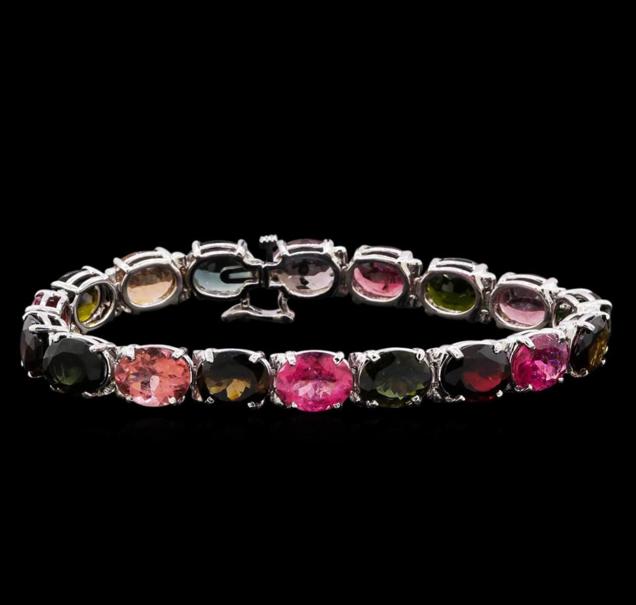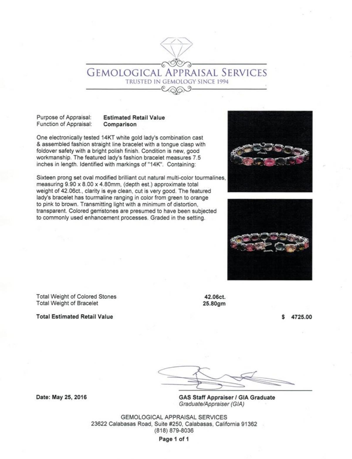 One electronically tested 14KT white gold lady's combination cast & assembled fashion straight line bracelet with a tongue clasp with foldover safety with a bright polish finish. The featured lady's fashion bracelet measures 7.5 inches in length. Identified with markings of "14K". Condition is new, good workmanship. Containing: Sixteen prong set oval modified brilliant cut natural multi-color tourmalines, measuring 9.90 x 8.00 x 4.80mm, (depth est.) approximate total weight of 42.06ct., clarity is eye clean, cut is very good. The featured lady's bracelet has tourmaline ranging in color from green to orange to pink to brown. Transmitting light with a minimum of distortion, transparent. Colored gemstones are presumed to have been subjected to commonly used enhancement processes. Graded in the setting. Total Weight of Colored Stones 42.06ct. Total Weight of Bracelet 25.80gm. GAS Appraised.