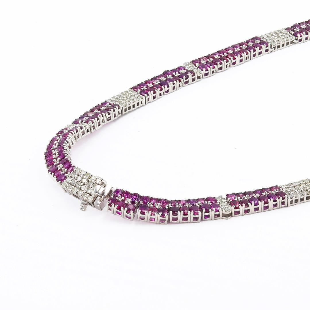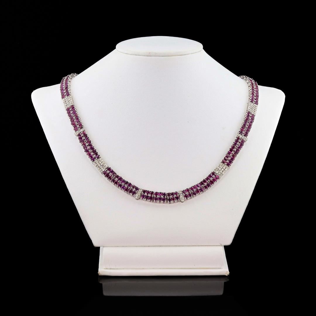 One polished. stamped. and tested platinum necklace marked Oscar Friedman. The necklace is mounted with: 266 genuine oval shaped rubies weighing approximately 42.21 carats, and 224 genuine round diamonds weighing approximately 3.95 carats. The necklace measures 19.5 inches in length and is finished with a tension lock clasp and folding safety clasp. This item weighs 78.9 grams. condition is new. excellent workmanship. #MAIN GEMSTONES# Species: Natural Corundum Variety: Ruby Shape: Oval Cutting Style: Brilliant Cut Crown, Step Cut Pavilion Quantity: 266 Rubies Measurements: 3 x 2.5 - 4 x 3mm Total Weight: 42.21 carats Color: Red Cut Grade: Good - Very Good Refractive Index: 1.762 - 1.770 DR Hardness: 9 #ADJACENT GEMSTONES ON NECKLACE# Identity: Natural Diamond Shape: Round Cutting Style: Brilliant Cut Quantity: 224 Diamonds Measurements: 1.5 - 1.8mm Total Weight: 3.95 carats Clarity Grade: SI1-SI3 Color Grade: G-H Refractive Index: 2.417 Hardness: 10 TOTAL RUBY WEIGHT: 42.21 cts TOTAL DIAMOND WEIGHT: 3.95 cts WEIGHT OF ITEM: 78.9 grams METAL: Platinum #LREF-26321