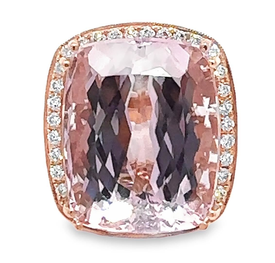 One electronically tested 14KT rose gold lady's cast fashion ring with a Raised and Scalloped Gallery with a bright polish with migraine detailing finish. The featured lady's ring has a shank measuring 3.50 millimeters. Identified with markings of "14K". Condition is new, good workmanship. Containing: One prong set rectangular cushion modified mixed cut natural kunzite, measuring 21.80 x 17.55 x 12.93mm, (depth est.) 10% bulge factor, approximate weight of 42.64ct., clarity is eye clean, light, moderately strong, purple red color, (GIA PR 3/4), cut is very good. Transmitting light with no distortion, transparent. Colored gemstones are presumed to have been subjected to commonly used enhancement processes. Graded in the setting. Thirty-Six bead set round brilliant cut diamonds, measuring 1.75 - 1.70 x 1.08mm (depth est.) approximate total weight of 36 Stones = 0.76ct. Graded in the setting. Color G - H Clarity VS-2 to SI-1 Cut Very Good Total Weight of Colored Stones 42.64ct. Total Weight of Diamonds 0.76ct. Total Weight of Ring 19.60gm Estimated Retail Value $ 17675.00
