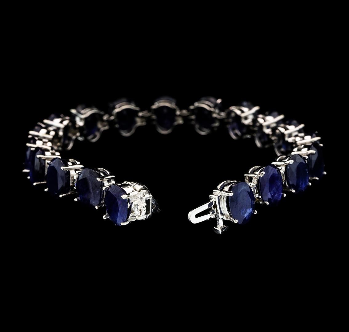One electronically tested 14KT white gold lady's combination cast & assembled fashion bracelet with a tongue clasp with foldover safety with a bright polish finish. The featured lady's bracelet measures approximately seven inches in length. Identified with markings of '14K'. Condition is new, good workmanship. Containing: Nineteen prong set oval modified mixed cut natural blue sapphires, measuring 8.95 x 6.90 x 4.49mm, (depth est.) approximate total weight of 42.73ct., clarity is heavily included, medium dark, moderately strong, blue color, (GIA B 6/4), cut is good. Transmitting light somewhat diffusely, semi-transparent to translucent. Naturally occurring internal & external characteristics are present. Indications of laboratory high temperature heat treatment, with glass & flux additives. Colored gemstones are presumed to have been subjected to commonly used enhancement processes. Graded in the setting. Nineteen prong set round brilliant cut diamonds, measuring 2.40 - 2.30 x 1.41mm (depth est.) approximate total weight of 19 Stones = 0.87ct. Graded in the setting. Clarity VS-2 to SI-1. Color: G - H Cut Very Good. Total Weight of Colored Stones 42.73ct.. Total Weight of Diamonds 0.87ct.. Total Weight of Bracelet 24.10gm GAS Appraised at $9,245.00.
