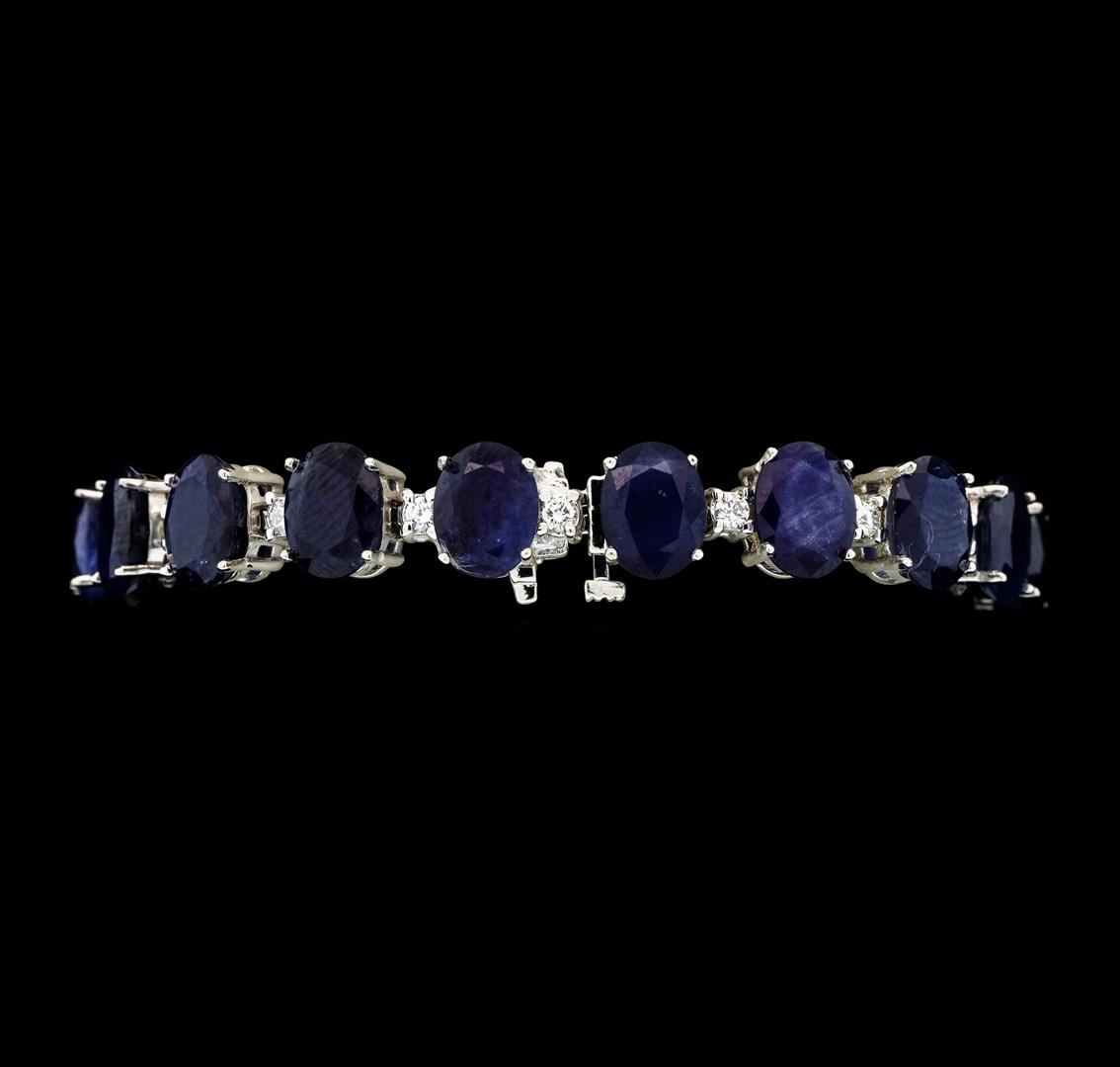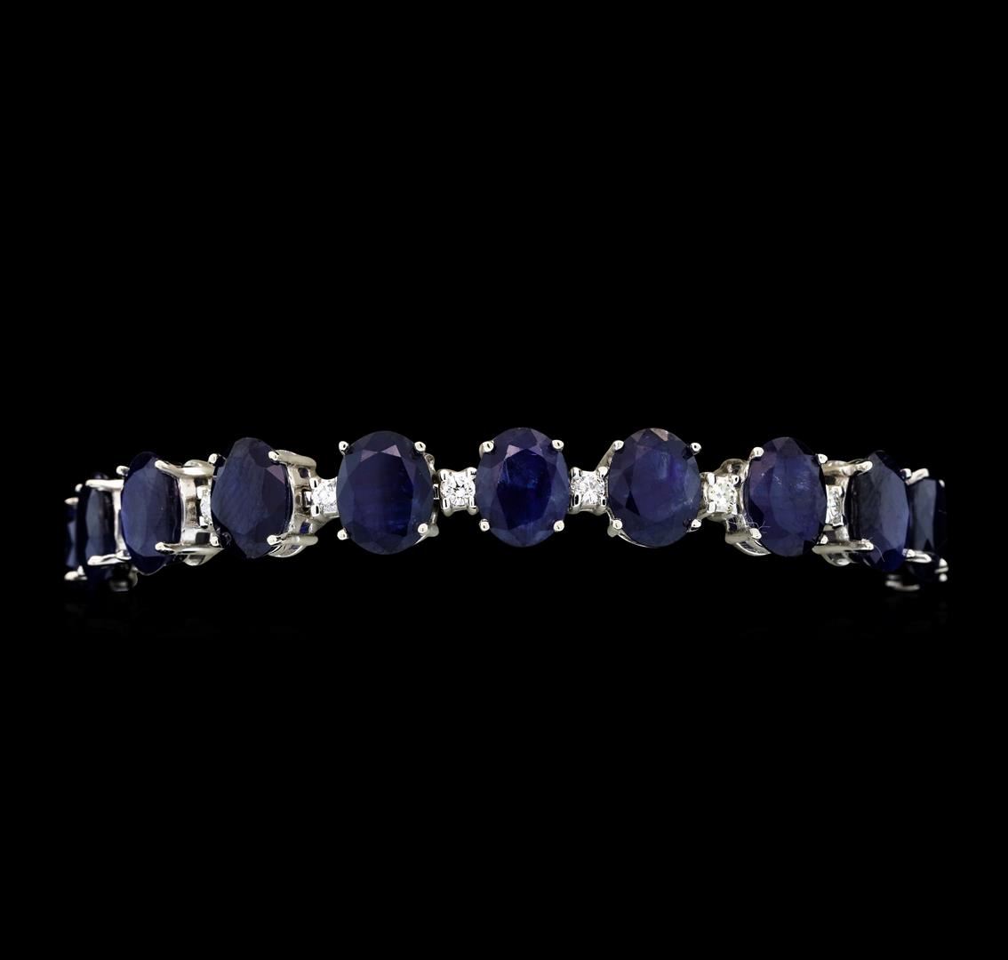 One electronically tested 14KT white gold lady's combination cast & assembled fashion bracelet with a tongue clasp with foldover safety with a bright polish finish. The featured lady's bracelet measures approximately seven inches in length. Identified with markings of '14K'. Condition is new, good workmanship. Containing: Nineteen prong set oval modified mixed cut natural blue sapphires, measuring 8.95 x 6.90 x 4.49mm, (depth est.) approximate total weight of 42.73ct., clarity is heavily included, medium dark, moderately strong, blue color, (GIA B 6/4), cut is good. Transmitting light somewhat diffusely, semi-transparent to translucent. Naturally occurring internal & external characteristics are present. Indications of laboratory high temperature heat treatment, with glass & flux additives. Colored gemstones are presumed to have been subjected to commonly used enhancement processes. Graded in the setting. Nineteen prong set round brilliant cut diamonds, measuring 2.40 - 2.30 x 1.41mm (depth est.) approximate total weight of 19 Stones = 0.87ct. Graded in the setting. Clarity VS-2 to SI-1. Color: G - H Cut Very Good. Total Weight of Colored Stones 42.73ct.. Total Weight of Diamonds 0.87ct.. Total Weight of Bracelet 24.10gm GAS Appraised at $9,245.00.