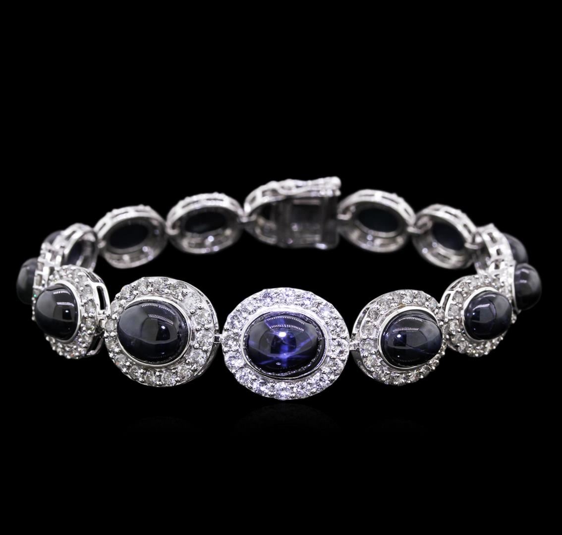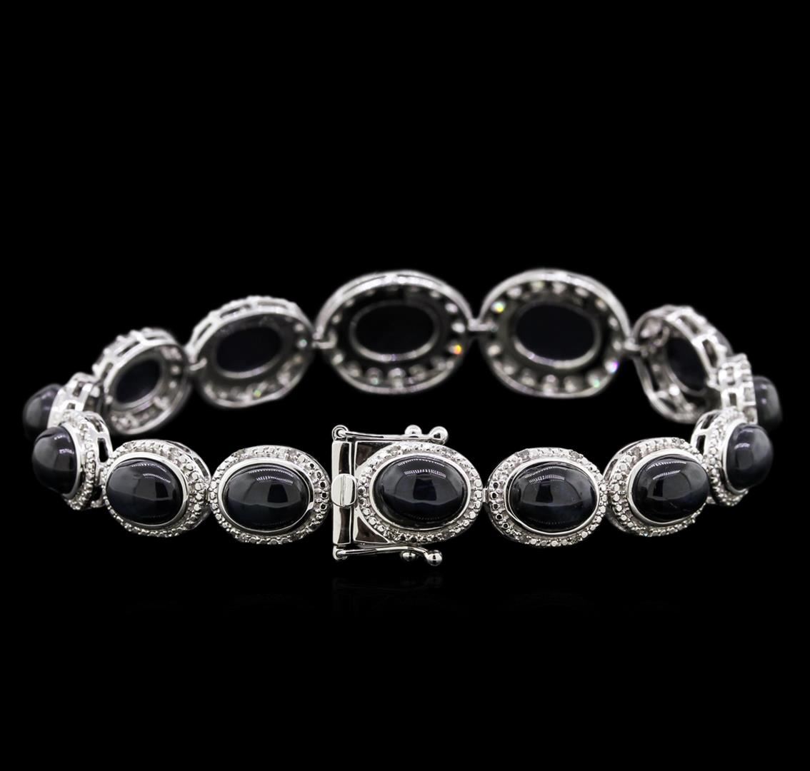 One electronically tested 14KT white gold ladies cast & assembled star sapphire and diamond bracelet. Seven and one-quarter inch length bracelet features a graduating flexible star sapphire and diamond bezel ribbon, terminating in a concealed clasp with twin safeties. Bright polish finish. Trademark is Orianne. Identified with markings of "14K". Condition is new, good workmanship. Containing: Fourteen prong set oval cabochon cut natural blue star sapphires approximate total weight of 42.76ct., dark, very slightly grayish, violetish blue color, (GIA vB 7/3), cut is good. Each stone has a complete six ray star with strong intensity and good movement. Transmitting light very diffusely, opaque. Naturally occurring internal & external characteristics are present. Color grade is an average for the group. Indications of laboratory high temperature diffusion treatment. Graded in the setting. One Hundred Thirty-Six prong set round brilliant and single cut diamonds approximate total weight of 136 Stones = 3.48ct. Graded in the setting. Clarity: I-1 to I-2. Color: G - I. Total Weight of Colored Stones 42.76ct. Total Weight of Diamonds 3.48ct. Total Weight of Bracelet 27.55gm. AIG Appraised at $21,805.00.