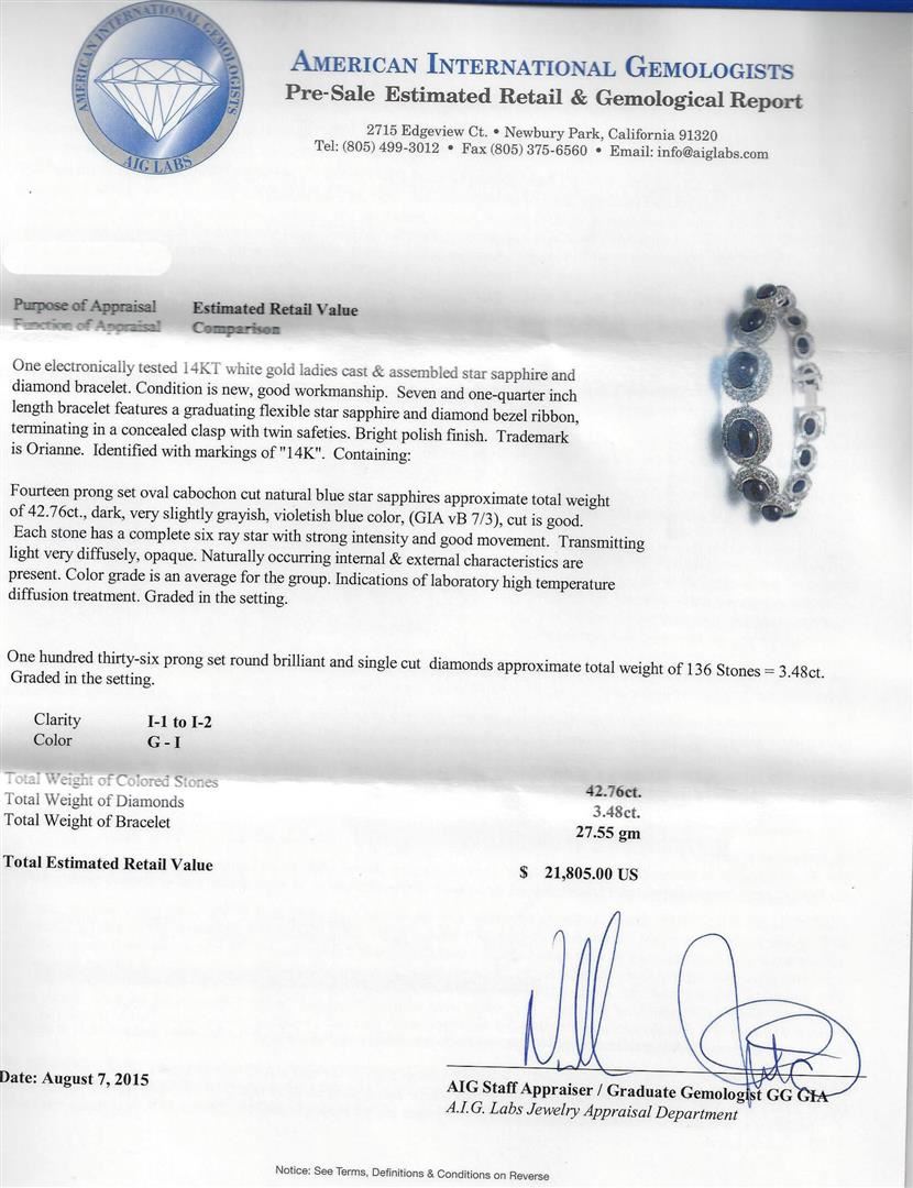 One electronically tested 14KT white gold ladies cast & assembled star sapphire and diamond bracelet. Seven and one-quarter inch length bracelet features a graduating flexible star sapphire and diamond bezel ribbon, terminating in a concealed clasp with twin safeties. Bright polish finish. Trademark is Orianne. Identified with markings of "14K". Condition is new, good workmanship. Containing: Fourteen prong set oval cabochon cut natural blue star sapphires approximate total weight of 42.76ct., dark, very slightly grayish, violetish blue color, (GIA vB 7/3), cut is good. Each stone has a complete six ray star with strong intensity and good movement. Transmitting light very diffusely, opaque. Naturally occurring internal & external characteristics are present. Color grade is an average for the group. Indications of laboratory high temperature diffusion treatment. Graded in the setting. One Hundred Thirty-Six prong set round brilliant and single cut diamonds approximate total weight of 136 Stones = 3.48ct. Graded in the setting. Clarity: I-1 to I-2. Color: G - I. Total Weight of Colored Stones 42.76ct. Total Weight of Diamonds 3.48ct. Total Weight of Bracelet 27.55gm. AIG Appraised at $21,805.00.