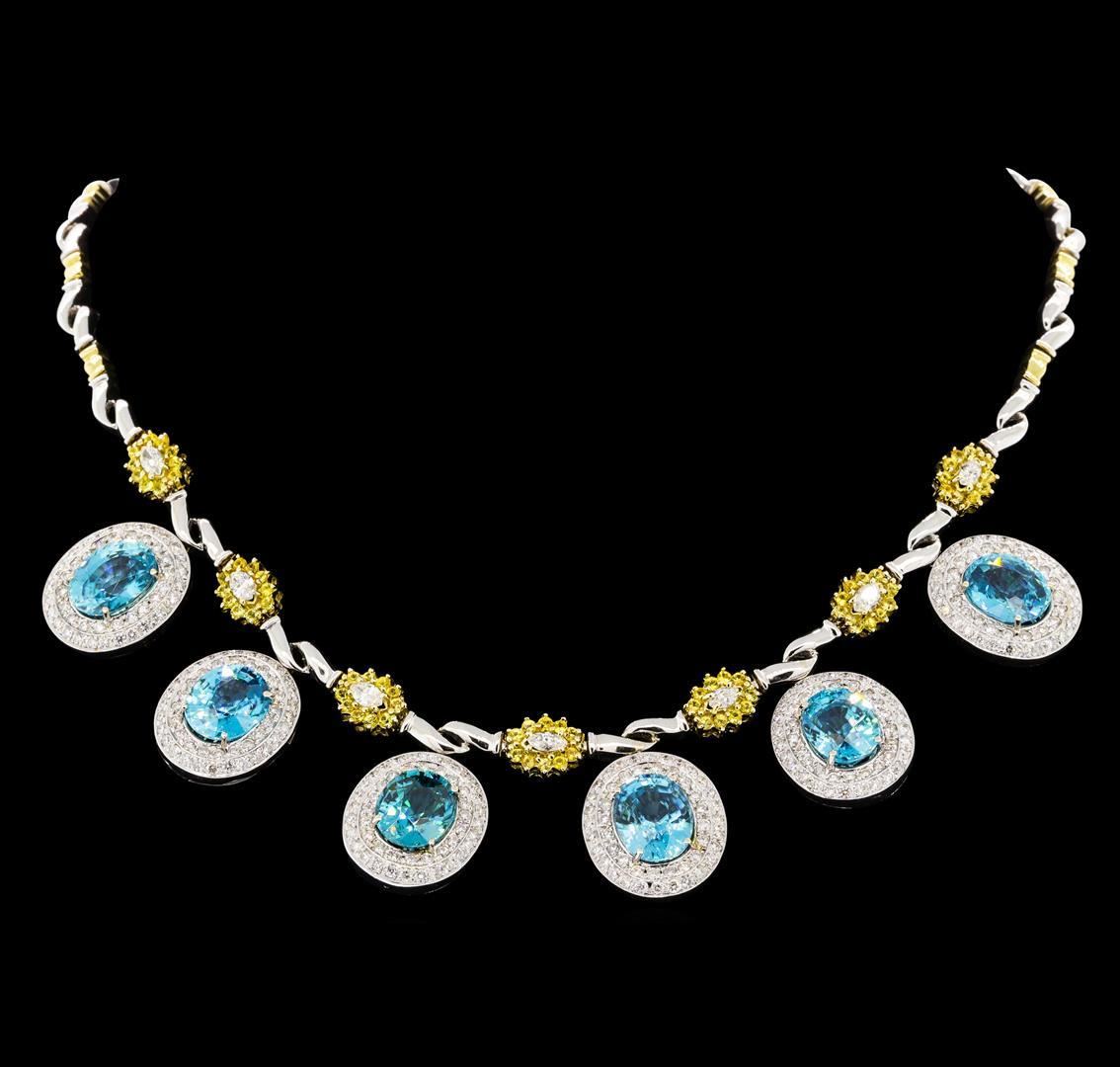 One electronically tested 14-18KT white and yellow gold lady's combination cast & assembled fashion necklace with a tongue clasp with foldover safety with a bright polish finish. The featured lady's necklace is cast from 14KT white and yellow gold and measures approximately seventeen inches in length. The necklace contains seven yellow sapphire and diamond starburst motifs and six blue zircons set in dangling drop double halo motifs. The dangling double halo motifs are cast from 18KT white gold. Condition is new, good workmanship. Containing: Six prong set oval modified mixed cut natural blue zircons, measuring 11.70 x 9.30 x 6.30mm, (depth est.) approximate total weight of 41.88ct., clarity is eye clean, medium, moderately strong, very strongly greenish blue color, (GIA vstgB 5/4), cut is very good. Transmitting light with no distortion, transparent. Colored gemstones are presumed to have been subjected to commonly used enhancement processes. Graded in the setting. Seventy prong set round modified brilliant cut natural yellow sapphires, measuring 1.80 - 1.40 x 1.04 mm, (depth est.) approximate total weight of 2.10 ct., clarity is slightly included, medium, moderately strong, yellow color, (GIA Y 5/4), cut is good. Transmitting light with a minimum of distortion, transparent. Colored gemstones are presumed to have been subjected to commonly used enhancement processes. Graded in the setting. Seven prong set marquise shaped cut diamonds, measuring 4.70 x 2.80 x 1.76mm (depth est.) approximate total weight of 7 Stones = 0.94ct. Graded in the setting. Color G - H Clarity SI-1 to SI-2 Cut Good Two Hundred Forty bead set round brilliant cut diamonds, measuring 1.70 - 1.60 x 1.02mm (depth est.) approximate total weight of 240 Stones = 4.05ct. Graded in the setting. Color G - I Clarity VS-2 to SI-2 Cut Good. Total Weight of Colored Stones 43.98ct.. Total Weight of Diamonds 4.99ct.. Total Weight of Necklace 66.30gm GAS Appraised.