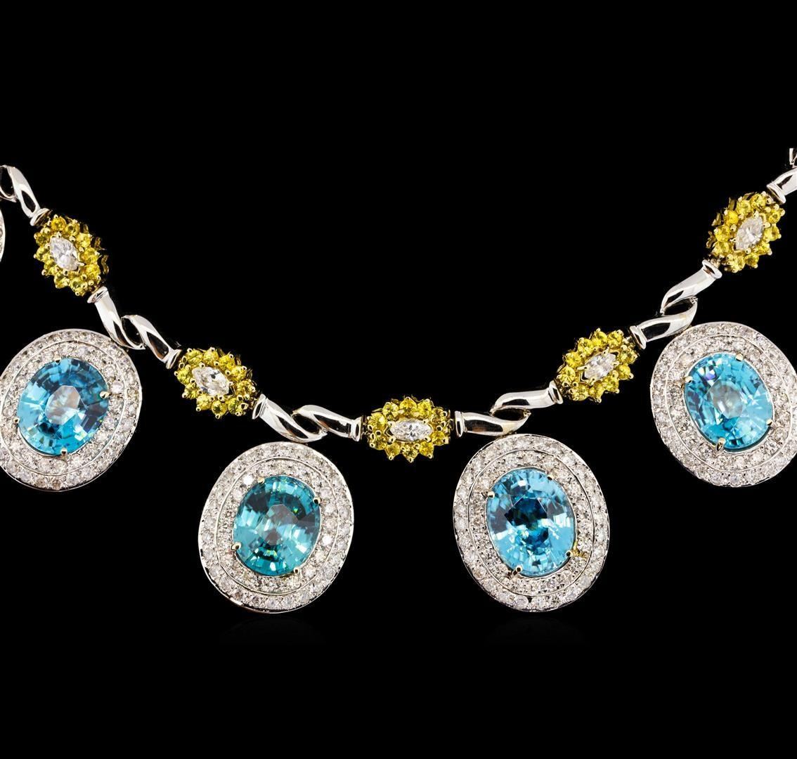 One electronically tested 14-18KT white and yellow gold lady's combination cast & assembled fashion necklace with a tongue clasp with foldover safety with a bright polish finish. The featured lady's necklace is cast from 14KT white and yellow gold and measures approximately seventeen inches in length. The necklace contains seven yellow sapphire and diamond starburst motifs and six blue zircons set in dangling drop double halo motifs. The dangling double halo motifs are cast from 18KT white gold. Condition is new, good workmanship. Containing: Six prong set oval modified mixed cut natural blue zircons, measuring 11.70 x 9.30 x 6.30mm, (depth est.) approximate total weight of 41.88ct., clarity is eye clean, medium, moderately strong, very strongly greenish blue color, (GIA vstgB 5/4), cut is very good. Transmitting light with no distortion, transparent. Colored gemstones are presumed to have been subjected to commonly used enhancement processes. Graded in the setting. Seventy prong set round modified brilliant cut natural yellow sapphires, measuring 1.80 - 1.40 x 1.04 mm, (depth est.) approximate total weight of 2.10 ct., clarity is slightly included, medium, moderately strong, yellow color, (GIA Y 5/4), cut is good. Transmitting light with a minimum of distortion, transparent. Colored gemstones are presumed to have been subjected to commonly used enhancement processes. Graded in the setting. Seven prong set marquise shaped cut diamonds, measuring 4.70 x 2.80 x 1.76mm (depth est.) approximate total weight of 7 Stones = 0.94ct. Graded in the setting. Color G - H Clarity SI-1 to SI-2 Cut Good Two Hundred Forty bead set round brilliant cut diamonds, measuring 1.70 - 1.60 x 1.02mm (depth est.) approximate total weight of 240 Stones = 4.05ct. Graded in the setting. Color G - I Clarity VS-2 to SI-2 Cut Good. Total Weight of Colored Stones 43.98ct.. Total Weight of Diamonds 4.99ct.. Total Weight of Necklace 66.30gm GAS Appraised.