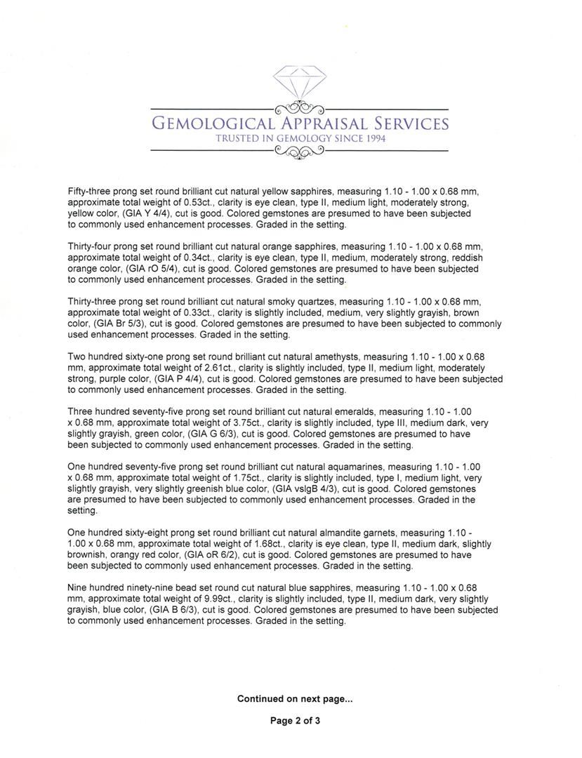 One electronically tested 18KT yellow gold combination cast & assembled fashion perfume bottle holder with a bright polish with milgrain detailing finish. Identified with markings of "750". Condition is like new, good workmanship. Containing: Eighteen prong set round brilliant cut diamonds, measuring 2.00 - 1.90 x 1.27mm (depth est.) approximate total weight of 18 Stones = 0.53ct. Graded in the setting. Clarity: VS-1 to VS-2. Color: F - G. Cut Very Good One Hundred Eighty-Four prong set round brilliant cut diamonds, measuring 1.50 - 1.40 x 0.94mm (depth est.) approximate total weight of 184 Stones = 2.20ct. Graded in the setting. Clarity: VS-1 to VS-2. Color: F - Very Good One bezel set round modified brilliant cut natural blue sapphire, measuring 7.50 - 7.45 x 4.86 mm, approximate weight of 2.20ct., clarity is slightly included, type II, dark, moderately strong, blue color, (GIA B 7/4), cut is excellent. Colored gemstones are presumed to have been subjected to commonly used enhancement processes. Graded in the setting. Two hundred ninety-four prong set round brilliant cut natural rubies, measuring 1.10 - 1.00 x 0.68 mm, approximate total weight of 2.94ct., clarity is eye clean, type II, medium dark, moderately strong, red color, (GIA R 6/4), cut is good. Colored gemstones are presumed to have been subjected to commonly used enhancement processes. Graded in the setting. One hundred seventy-nine prong set round brilliant cut natural pink sapphires, measuring 1.10 - 1.00 x 0.68 mm, approximate total weight of 1.79ct., clarity is eye clean, type II, medium, moderately strong, purple red color, (GIA PR 5/4), cut is good. Colored gemstones are presumed to have been subjected to commonly used enhancement processes. Graded in the setting. Fifty-three prong set round brilliant cut natural yellow sapphires, measuring 1.10 - 1.00 x 0.68 mm, approximate total weight of 0.53ct., clarity is eye clean, type II, medium light, moderately strong, yellow color, (GIA Y 4/4), cut is good. Colored gemstones are presumed to have been subjected to commonly used enhancement processes. Graded in the setting. Thirty-four prong set round brilliant cut natural orange sapphires, measuring 1.10 - 1.00 x 0.68 mm, approximate total weight of 0.34ct., clarity is eye clean, type II, medium, moderately strong, reddish orange color, (GIA rO 5/4), cut is good. Colored gemstones are presumed to have been subjected to commonly used enhancement processes. Graded in the setting. Thirty-three prong set round brilliant cut natural smoky quartzes, measuring 1.10 - 1.00 x 0.68 mm, approximate total weight of 0.33ct., clarity is slightly included, medium, very slightly grayish, brown color, (GIA Br 5/3), cut is good. Colored gemstones are presumed to have been subjected to commonly used enhancement processes. Graded in the setting. Two hundred sixty-one prong set round brilliant cut natural amethysts, measuring 1.10 - 1.00 x 0.68 mm, approximate total weight of 2.61ct., clarity is slightly included, type II, medium light, moderately strong, purple color, (GIA P 4/4), cut is good. Colored gemstones are presumed to have been subjected to commonly used enhancement processes. Graded in the setting. Three hundred seventy-five prong set round brilliant cut natural emeralds, measuring 1.10 - 1.00 x 0.68 mm, approximate total weight of 3.75ct., clarity is slightly included, type III, medium dark, very slightly grayish, green color, (GIA G 6/3), cut is good. Colored gemstones are presumed to have been subjected to commonly used enhancement processes. Graded in the setting. One hundred seventy-five prong set round brilliant cut natural aquamarines, measuring 1.10 - 1.00 x 0.68 mm, approximate total weight of 1.75ct., clarity is slightly included, type I, medium light, very slightly grayish, very slightly greenish blue color, (GIA vslgB 4/3), cut is good. Colored gemstones are presumed to have been subjected to commonly used enhancement processes. Graded in the setting. One hundred sixty-eight prong set round brilliant cut natural almandite garnets, measuring 1.10 - 1.00 x 0.68 mm, approximate total weight of 1.68ct., clarity is eye clean, type II, medium dark, slightly brownish, orangy red color, (GIA oR 6/2), cut is good. Colored gemstones are presumed to have been subjected to commonly used enhancement processes. Graded in the setting. Nine hundred ninety-nine bead set round cut natural blue sapphires, measuring 1.10 - 1.00 x 0.68 mm, approximate total weight of 9.99ct., clarity is slightly included, type II, medium dark, very slightly grayish, blue color, (GIA B 6/3), cut is good. Colored gemstones are presumed to have been subjected to commonly used enhancement processes. Graded in the setting. Nine hundred ninety-nine prong set round brilliant cut natural blue sapphires, measuring 1.10 - 1.00 x 0.68 mm, approximate total weight of 9.99ct., clarity is slightly included, type II, medium dark, moderately strong, blue color, (GIA B 6/4), cut is good. Colored gemstones are presumed to have been subjected to commonly used enhancement processes. Graded in the setting. Five hundred twenty-five prong set round brilliant cut natural blue sapphires, measuring 1.10 - 1.00 x 0.68 mm, approximate total weight of 5.25ct., clarity is slightly included, type II, medium dark, moderately strong, blue color, (GIA B 6/4), cut is good. Colored gemstones are presumed to have been subjected to commonly used enhancement processes. Graded in the setting. Total Weight of Colored Stones 43.15ct. Total Weight of Diamonds 2.73ct. Total Weight of Perfume Bottle Holder117.00gm. GAS Appraised at $81,595.00.