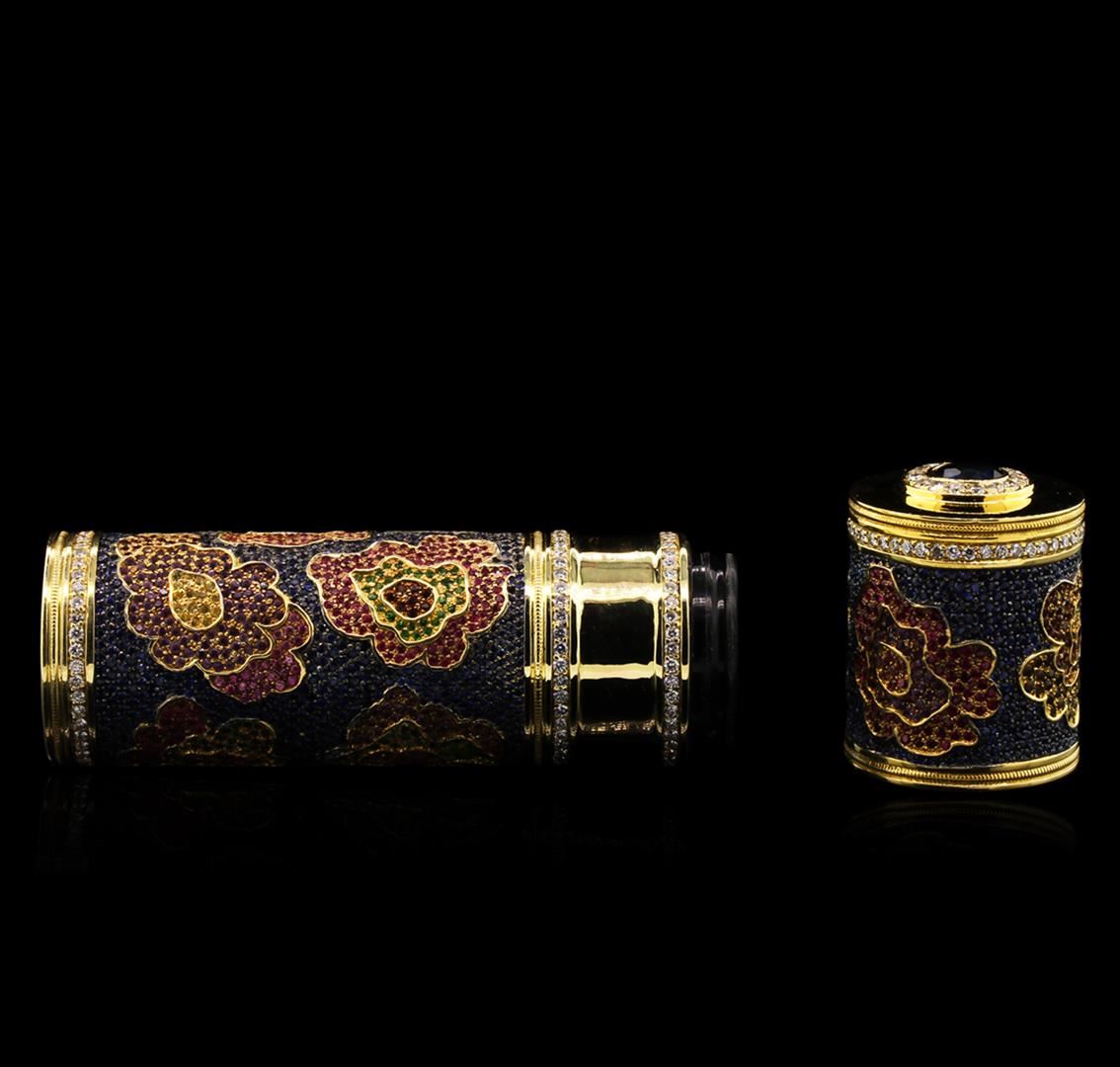 One electronically tested 18KT yellow gold combination cast & assembled fashion perfume bottle holder with a bright polish with milgrain detailing finish. Identified with markings of "750". Condition is like new, good workmanship. Containing: Eighteen prong set round brilliant cut diamonds, measuring 2.00 - 1.90 x 1.27mm (depth est.) approximate total weight of 18 Stones = 0.53ct. Graded in the setting. Clarity: VS-1 to VS-2. Color: F - G. Cut Very Good One Hundred Eighty-Four prong set round brilliant cut diamonds, measuring 1.50 - 1.40 x 0.94mm (depth est.) approximate total weight of 184 Stones = 2.20ct. Graded in the setting. Clarity: VS-1 to VS-2. Color: F - Very Good One bezel set round modified brilliant cut natural blue sapphire, measuring 7.50 - 7.45 x 4.86 mm, approximate weight of 2.20ct., clarity is slightly included, type II, dark, moderately strong, blue color, (GIA B 7/4), cut is excellent. Colored gemstones are presumed to have been subjected to commonly used enhancement processes. Graded in the setting. Two hundred ninety-four prong set round brilliant cut natural rubies, measuring 1.10 - 1.00 x 0.68 mm, approximate total weight of 2.94ct., clarity is eye clean, type II, medium dark, moderately strong, red color, (GIA R 6/4), cut is good. Colored gemstones are presumed to have been subjected to commonly used enhancement processes. Graded in the setting. One hundred seventy-nine prong set round brilliant cut natural pink sapphires, measuring 1.10 - 1.00 x 0.68 mm, approximate total weight of 1.79ct., clarity is eye clean, type II, medium, moderately strong, purple red color, (GIA PR 5/4), cut is good. Colored gemstones are presumed to have been subjected to commonly used enhancement processes. Graded in the setting. Fifty-three prong set round brilliant cut natural yellow sapphires, measuring 1.10 - 1.00 x 0.68 mm, approximate total weight of 0.53ct., clarity is eye clean, type II, medium light, moderately strong, yellow color, (GIA Y 4/4), cut is good. Colored gemstones are presumed to have been subjected to commonly used enhancement processes. Graded in the setting. Thirty-four prong set round brilliant cut natural orange sapphires, measuring 1.10 - 1.00 x 0.68 mm, approximate total weight of 0.34ct., clarity is eye clean, type II, medium, moderately strong, reddish orange color, (GIA rO 5/4), cut is good. Colored gemstones are presumed to have been subjected to commonly used enhancement processes. Graded in the setting. Thirty-three prong set round brilliant cut natural smoky quartzes, measuring 1.10 - 1.00 x 0.68 mm, approximate total weight of 0.33ct., clarity is slightly included, medium, very slightly grayish, brown color, (GIA Br 5/3), cut is good. Colored gemstones are presumed to have been subjected to commonly used enhancement processes. Graded in the setting. Two hundred sixty-one prong set round brilliant cut natural amethysts, measuring 1.10 - 1.00 x 0.68 mm, approximate total weight of 2.61ct., clarity is slightly included, type II, medium light, moderately strong, purple color, (GIA P 4/4), cut is good. Colored gemstones are presumed to have been subjected to commonly used enhancement processes. Graded in the setting. Three hundred seventy-five prong set round brilliant cut natural emeralds, measuring 1.10 - 1.00 x 0.68 mm, approximate total weight of 3.75ct., clarity is slightly included, type III, medium dark, very slightly grayish, green color, (GIA G 6/3), cut is good. Colored gemstones are presumed to have been subjected to commonly used enhancement processes. Graded in the setting. One hundred seventy-five prong set round brilliant cut natural aquamarines, measuring 1.10 - 1.00 x 0.68 mm, approximate total weight of 1.75ct., clarity is slightly included, type I, medium light, very slightly grayish, very slightly greenish blue color, (GIA vslgB 4/3), cut is good. Colored gemstones are presumed to have been subjected to commonly used enhancement processes. Graded in the setting. One hundred sixty-eight prong set round brilliant cut natural almandite garnets, measuring 1.10 - 1.00 x 0.68 mm, approximate total weight of 1.68ct., clarity is eye clean, type II, medium dark, slightly brownish, orangy red color, (GIA oR 6/2), cut is good. Colored gemstones are presumed to have been subjected to commonly used enhancement processes. Graded in the setting. Nine hundred ninety-nine bead set round cut natural blue sapphires, measuring 1.10 - 1.00 x 0.68 mm, approximate total weight of 9.99ct., clarity is slightly included, type II, medium dark, very slightly grayish, blue color, (GIA B 6/3), cut is good. Colored gemstones are presumed to have been subjected to commonly used enhancement processes. Graded in the setting. Nine hundred ninety-nine prong set round brilliant cut natural blue sapphires, measuring 1.10 - 1.00 x 0.68 mm, approximate total weight of 9.99ct., clarity is slightly included, type II, medium dark, moderately strong, blue color, (GIA B 6/4), cut is good. Colored gemstones are presumed to have been subjected to commonly used enhancement processes. Graded in the setting. Five hundred twenty-five prong set round brilliant cut natural blue sapphires, measuring 1.10 - 1.00 x 0.68 mm, approximate total weight of 5.25ct., clarity is slightly included, type II, medium dark, moderately strong, blue color, (GIA B 6/4), cut is good. Colored gemstones are presumed to have been subjected to commonly used enhancement processes. Graded in the setting. Total Weight of Colored Stones 43.15ct. Total Weight of Diamonds 2.73ct. Total Weight of Perfume Bottle Holder117.00gm. GAS Appraised at $81,595.00.