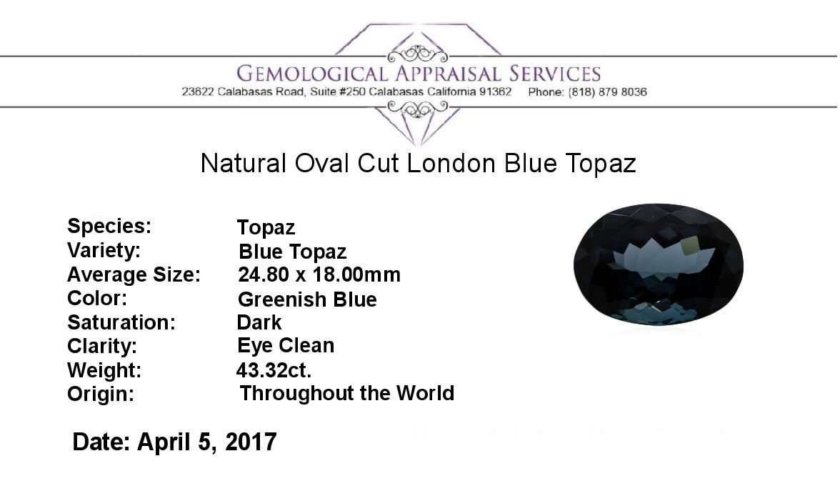 One natural oval cut london blue topaz with an exact weight of 43.32ct., clarity is eye clean, greenish blue, dark. Gemological Appraisals Services estimates the retail value at $866.4 GAS Appraised.