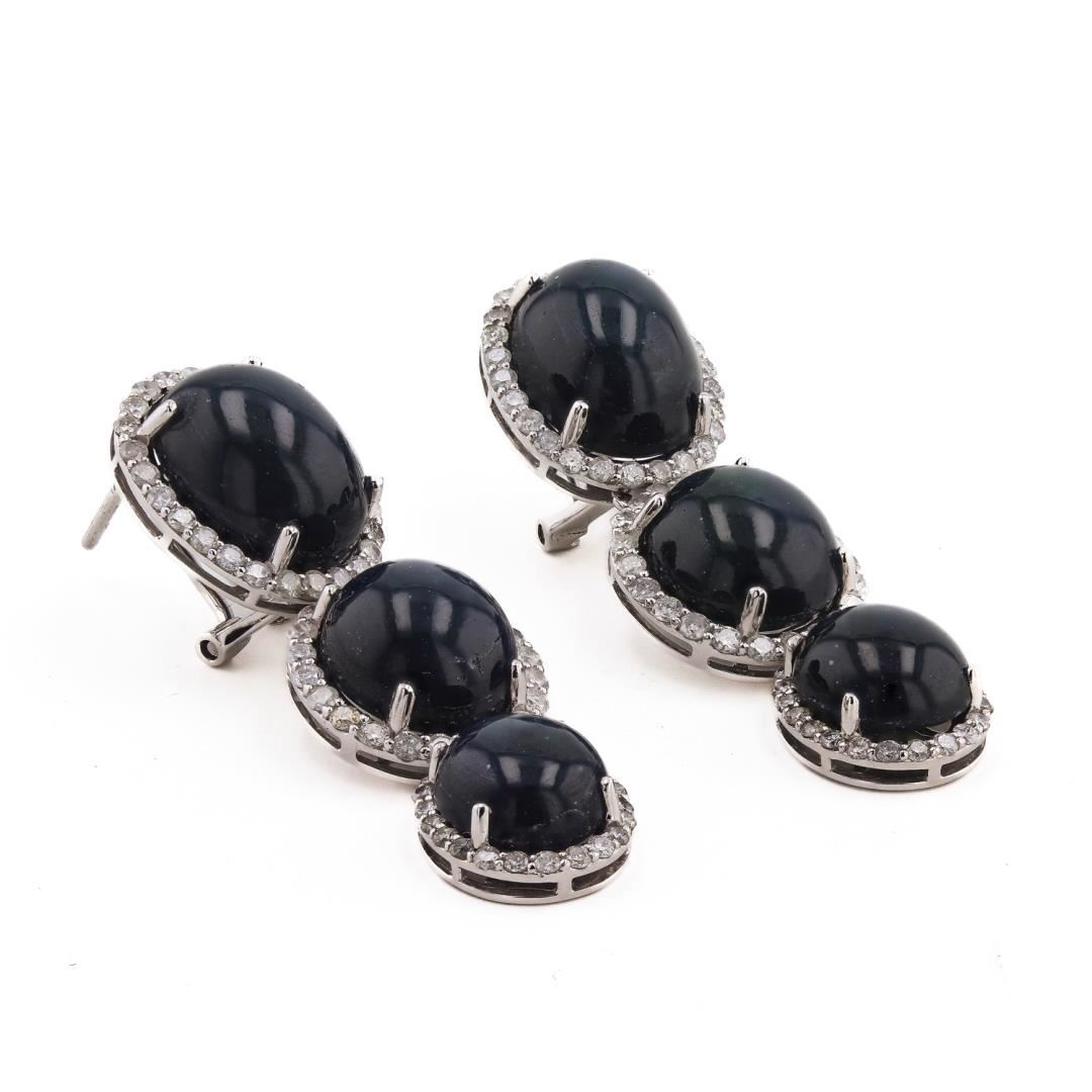 DESCRIPTION: ONE 14K WHITE GOLD LADY'S CUSTOM MADE DIAMOND and SAPPHIRE PAIR OF EARRINGS. 15.80 OR TW. CLIP BACKS #1 - MAIN GEMSTONE :# IDENTITY: ALL CENTER NATURAL SAPPHIRE SET IN PRONGS SETTING CARAT WEIGHT: 43.81 CTS TW .6 COUNTS SHAPE and MEASUREMEMT: OVAL CABOCHON CUT QUALITY: DARK BLUE . "DIFFUSED" QUALITY #2 - ADJACENT GEMSTONES :# IDENTITY: NATURAL DIAMONDS SHAPE: ROUND BRILLIANT CUT CARAT WEIGHT: 1.88 CTS QUALITY: I CLARITY RANGE, H/I COLOR