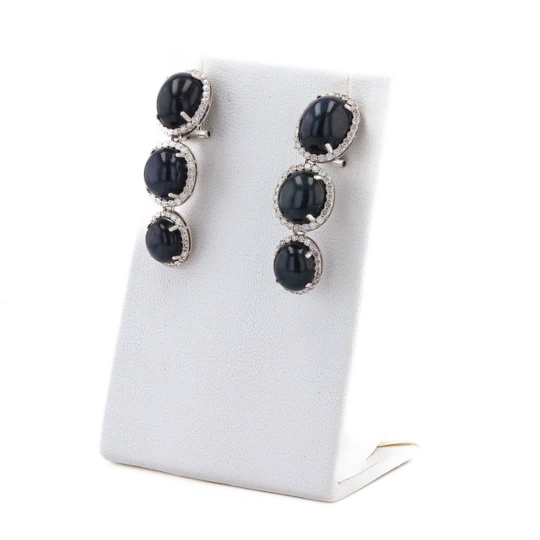 DESCRIPTION: ONE 14K WHITE GOLD LADY'S CUSTOM MADE DIAMOND and SAPPHIRE PAIR OF EARRINGS. 15.80 OR TW. CLIP BACKS #1 - MAIN GEMSTONE :# IDENTITY: ALL CENTER NATURAL SAPPHIRE SET IN PRONGS SETTING CARAT WEIGHT: 43.81 CTS TW .6 COUNTS SHAPE and MEASUREMEMT: OVAL CABOCHON CUT QUALITY: DARK BLUE . "DIFFUSED" QUALITY #2 - ADJACENT GEMSTONES :# IDENTITY: NATURAL DIAMONDS SHAPE: ROUND BRILLIANT CUT CARAT WEIGHT: 1.88 CTS QUALITY: I CLARITY RANGE, H/I COLOR