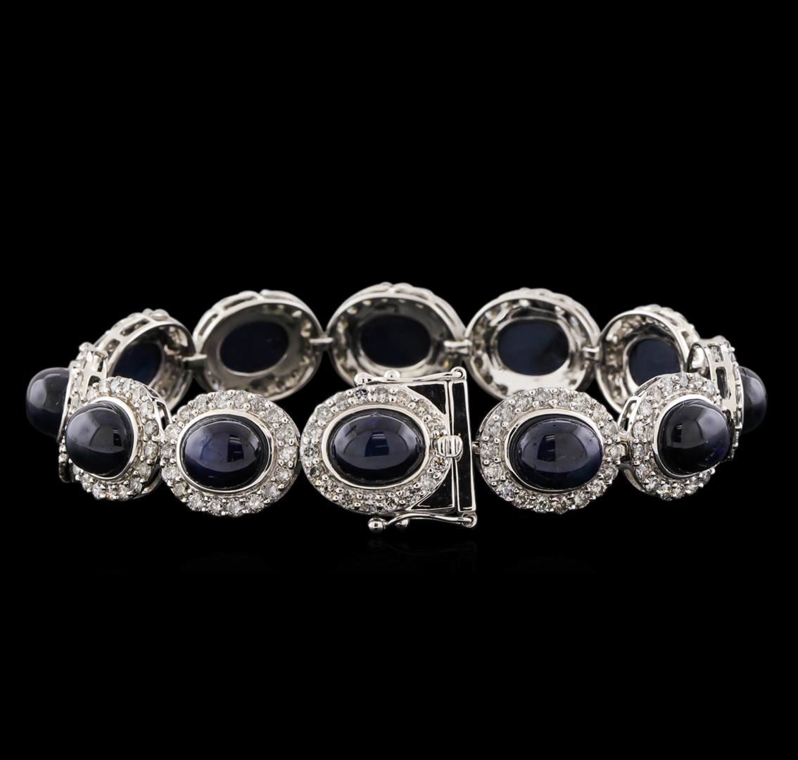 One electronically tested 14KT white gold ladies cast & assembled star sapphire and diamond bracelet. Seven inch length bracelet features a flexible star sapphire and diamond bezel ribbon, terminating in a concealed clasp with twin safeties. Bright polish finish. Trademark is Orianne. Identified with markings of "14K". Condition is new, good workmanship. Containing: Twelve prong set oval cabochon cut natural blue star sapphires approximate total weight of 44.19ct., dark, very slightly grayish, bluish violet color, (GIA bV 7/3), cut is good. Each stone has a complete six ray star with strong intensity and good movement. Transmitting light very diffusely, opaque. Naturally occurring internal & external characteristics are present. Color grade is an average for the group. Indications of laboratory high temperature diffusion treatment. Graded in the setting. Two Hundred Sixteen prong set round brilliant cut diamonds approximate total weight of 216 Stones = 6.11ct. Graded in the setting. Clarity: I-1 to I-2. Color: G - I. Total Weight of Colored Stones 44.19ct. Total Weight of Diamonds 6.11ct. Total Weight of Bracelet 28.48gm. AIG Appraised at $27,440.00.