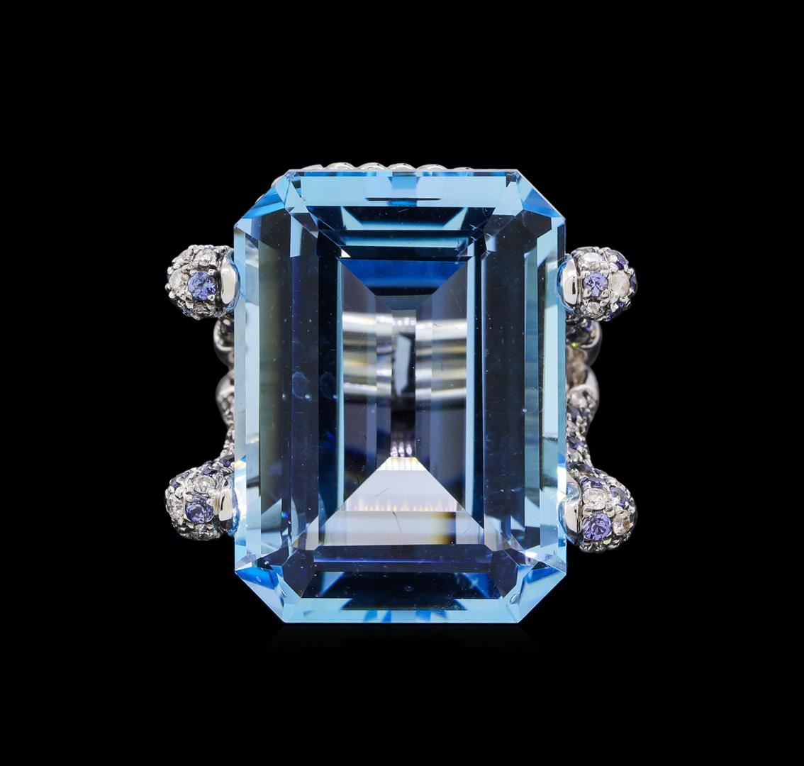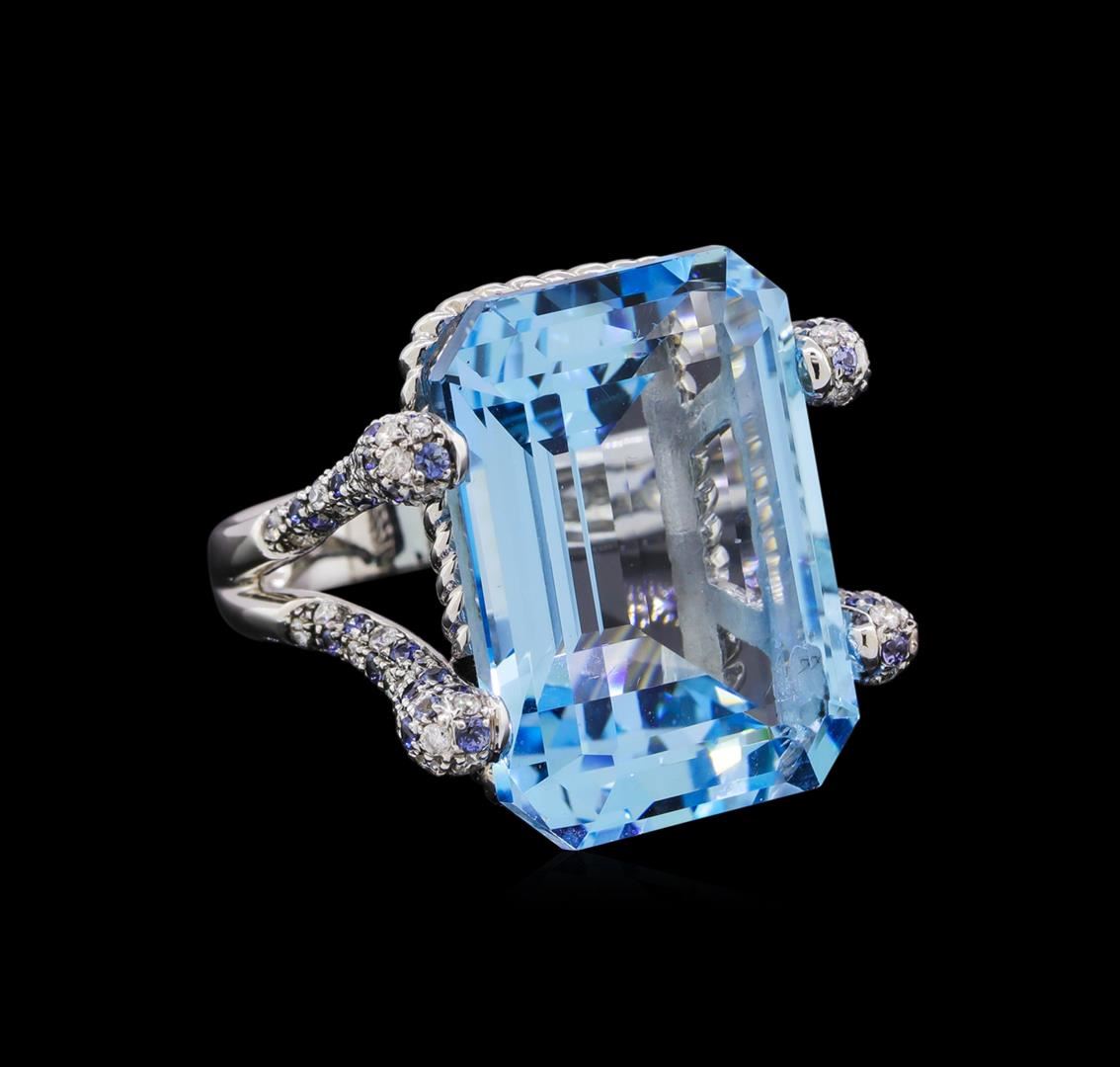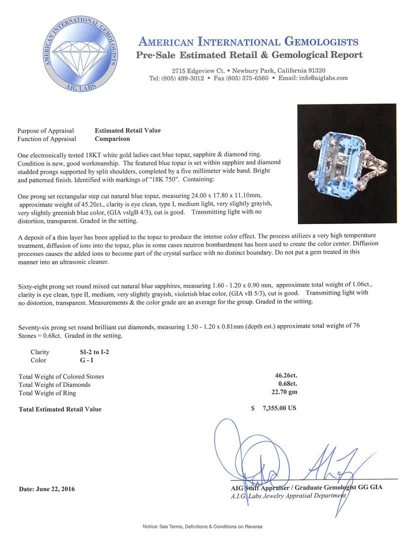 One electronically tested 18KT white gold ladies cast blue topaz, sapphire & diamond ring. The featured blue topaz is set within sapphire and diamond studded prongs supported by split shoulders, completed by a five millimeter wide band. Bright and patterned finish. Identified with markings of "18K 750". Condition is new, good workmanship. Containing: One prong set rectangular step cut natural blue topaz, measuring 24.00. x 17.80 x 11.10mm, approximate weight of 45.20ct., clarity is eye clean, type I, medium light, very slightly grayish, very slightly greenish blue color, (GIA vslgB 4/3), cut is good. Transmitting light with no distortion, transparent. Graded in the setting. A deposit of a thin layer has been applied to the topaz to produce the intense color effect. The process utilizes a very high temperature treatment, diffusion of ions into the topaz, plus in some cases neutron bombardment has been used to create the color center. Diffusion processes causes the added ions to become part of the crystal surface with no distinct boundary. Do not put a gem treated in this manner into an ultrasonic cleaner. Sixty-eight prong set round mixed cut natural blue sapphires, measuring 1.60 - 1.20 x 0.90 mm, approximate total weight of 1.06ct., clarity is eye clean, type II, medium, very slightly grayish, violetish blue color, (GIA vB 5/3), cut is good. Transmitting light with no distortion, transparent. Measurements & the color grade are an average for the group. Graded in the setting. Seventy-Six prong set round brilliant cut diamonds, measuring 1.50 - 1.20 x 0.81mm (depth est.) approximate total weight of 76 Stones = 0.68ct. Graded in the setting. Clarity: SI-2 to I-2 . Color: G - I. Total Weight of Colored Stones 46.26ct.. Total Weight of Diamonds 0.68ct.. Total Weight of Ring 22.70gm. AIG Appraised at $7,355.00.