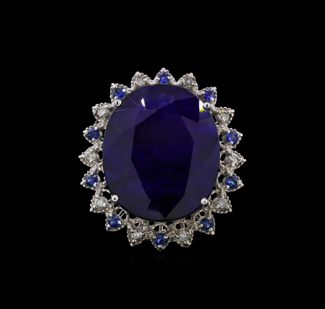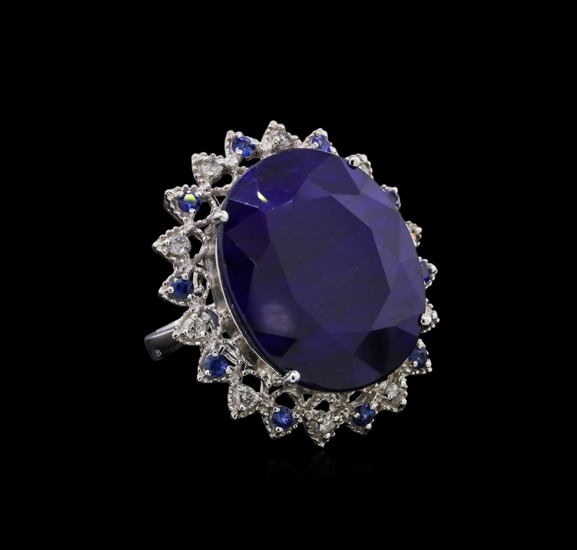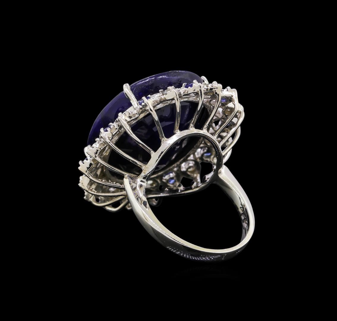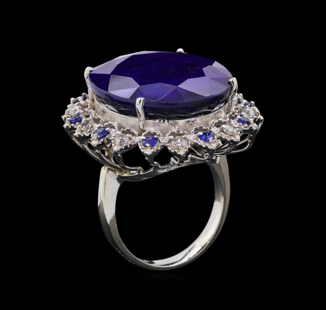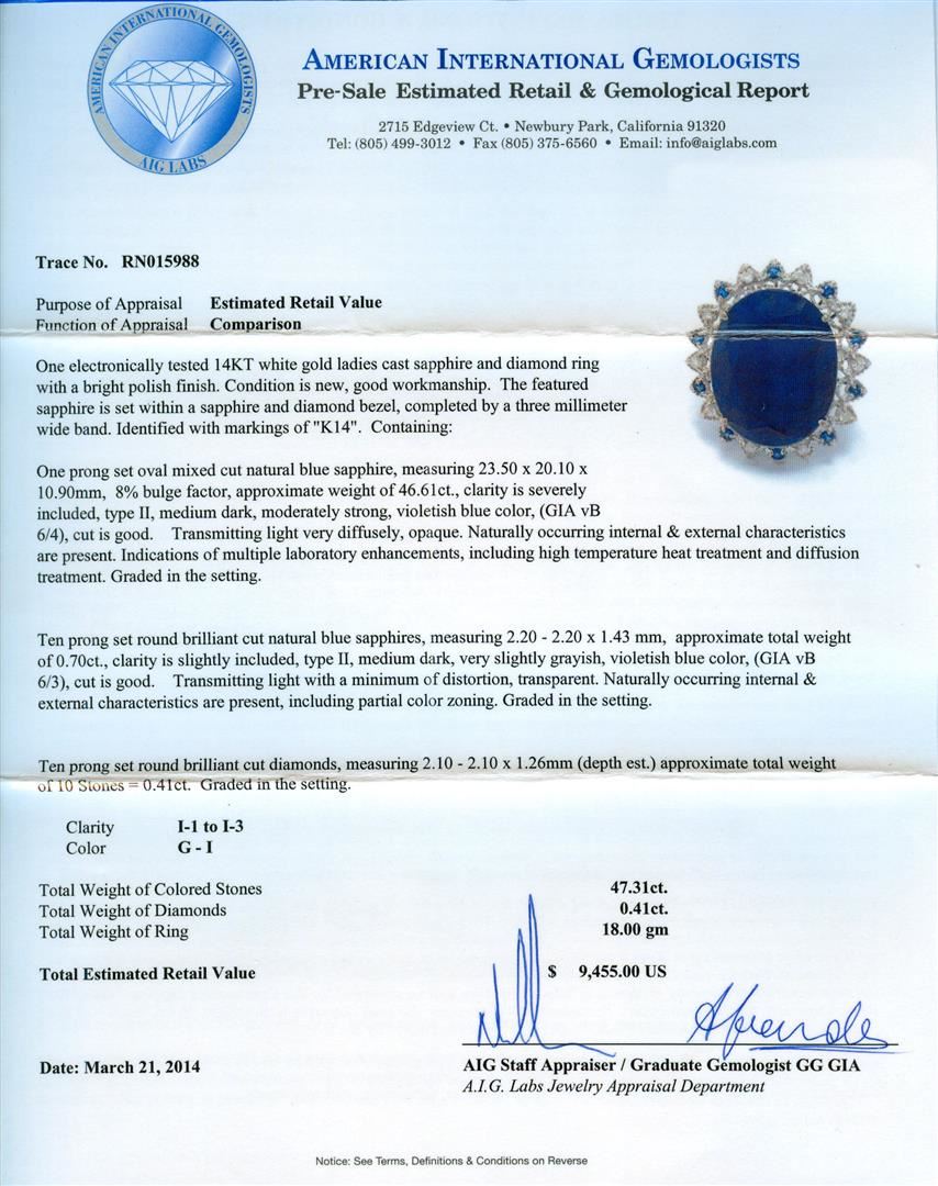 One electronically tested 14KT white gold ladies cast sapphire and diamond ring with a bright polish finish. The featured sapphire is set within a sapphire and diamond bezel, completed by a three millimeter wide band. Identified with markings of "K14". Condition is new, good workmanship. Containing: One prong set oval mixed cut natural blue sapphire, measuring 23.50 x 20.10 x 10.90mm, 8%. bulge factor, approximate weight of 46.61ct., clarity is severely included, type II, medium dark, moderately strong, violetish blue color, (GIA vB 6/4), cut is good. Transmitting light very diffusely, opaque. Naturally occurring internal & external characteristics are present. Indications of multiple laboratory enhancements, including high temperature heat treatment and diffusion treatment. Graded in the setting. Ten prong set round brilliant cut natural blue sapphires, measuring 2.20 - 2.20 x 1.43 mm, approximate total weight of 0.70ct., clarity is slightly included, type II, medium dark, very slightly grayish, violetish blue color, (GIA vB 6/3), cut is good. Transmitting light with a minimum of distortion, transparent. Naturally occurring internal & external characteristics are present, including partial color zoning. Graded in the setting. Ten prong set round brilliant cut diamonds, measuring 2.10 - 2.10 x 1.26mm (depth est.) approximate total weight of 10 Stones = 0.41ct. Graded in the setting. Clarity: I-1 to I-3. Color: G - I. Total Weight of Colored Stones 47.31ct. Total Weight of Diamonds 0.41ct. Total Weight of Ring 18.00gm. AIG Appraised at $9,455.00.