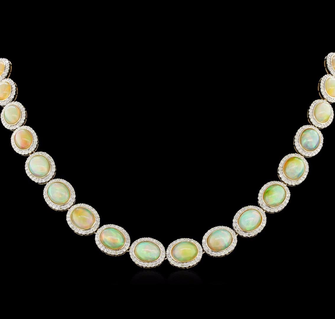 One electronically tested 14KT yellow gold ladies cast & assembled opal and diamond necklace. Condition is new, good workmanship. Eighteen and one-quarter inch length necklace features a slightly graduating flexible opal and diamond bezel ribbon, terminating in a concealed clasp with twin safeties. Bright polish finish with rhodium accents. Trademark is Orianne. Identified with markings of "14K". Containing: Thirty-three semi crystal opals that are cut in a oval shaped cabochon and are bezel set, measuring 9.00 mm long x 7.00 mm wide, and 4.40 mm thick and the approximate weight is 48.17 carats. The opals have a somewhat bright, orange-green play of color (fire) in a flashfire pattern; a high dome; a good cut; slightly included; slight variation in base in their brightness and pattern; and are slightly directional. Measurements are an average for the group. Graded in the setting. Seven hundred ninety-two prong set round brilliant cut diamonds approximate total weight of 792 Stones = 8.22ct. Graded in the setting. Clarity: I-2 to I-3. Color: I - K. Total Weight of Colored Stones: 48.17ct. Total Weight of Diamonds: 8.22ct. Total Weight of Necklace: 44.45gm. AIG Appraised at $37,440.00.