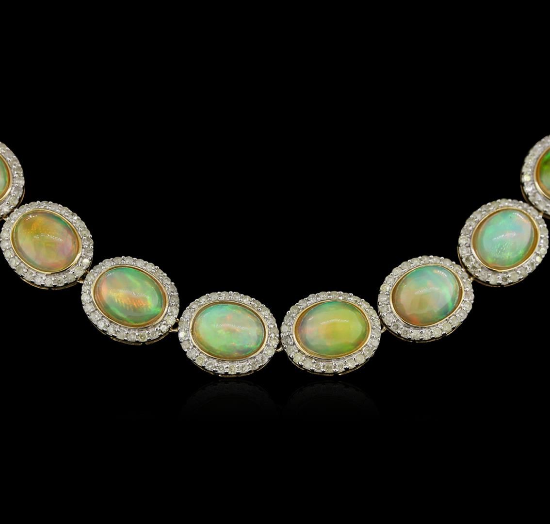 One electronically tested 14KT yellow gold ladies cast & assembled opal and diamond necklace. Condition is new, good workmanship. Eighteen and one-quarter inch length necklace features a slightly graduating flexible opal and diamond bezel ribbon, terminating in a concealed clasp with twin safeties. Bright polish finish with rhodium accents. Trademark is Orianne. Identified with markings of "14K". Containing: Thirty-three semi crystal opals that are cut in a oval shaped cabochon and are bezel set, measuring 9.00 mm long x 7.00 mm wide, and 4.40 mm thick and the approximate weight is 48.17 carats. The opals have a somewhat bright, orange-green play of color (fire) in a flashfire pattern; a high dome; a good cut; slightly included; slight variation in base in their brightness and pattern; and are slightly directional. Measurements are an average for the group. Graded in the setting. Seven hundred ninety-two prong set round brilliant cut diamonds approximate total weight of 792 Stones = 8.22ct. Graded in the setting. Clarity: I-2 to I-3. Color: I - K. Total Weight of Colored Stones: 48.17ct. Total Weight of Diamonds: 8.22ct. Total Weight of Necklace: 44.45gm. AIG Appraised at $37,440.00.