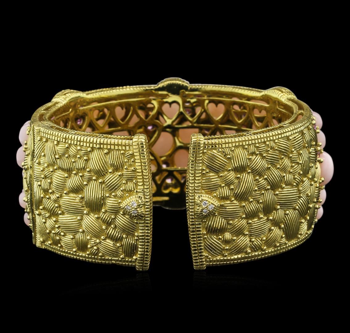 One electronically tested 18KT yellow gold ladies cast & assembled pink opal, pink sapphire & diamond cuff bracelet with a bright and satin finish. The cuff bracelet is from Judith Ripka's Aurora Collection. The six and one-quarter inch wearable length cuff features a one and three-eighths inch wide pink opal ribbon interspersed by pink sapphires and accented by diamond set stations. The cuff is supported by a hinge on one side. Trademark is Judith Ripka. Identified with markings of "18K". Condition is good. Containing: Sixty-eight prong set oval cabochon cut natural pink opals approximate total weight of 48.60ct., medium dark, moderately strong, pink color, (GIA Pk 6/4), cut is good. Transmitting light very diffusely, opaque. Naturally occurring internal & external characteristics are present. Color grade is an average for the group. Graded in the setting. Fifty-eight prong set round mixed cut natural pink sapphires, measuring 4.00 - 2.00 x 1.95 mm, approximate total weight of 7.14ct., clarity is eye clean, type II, medium, moderately strong, slightly purplish red color, (GIA slpR 5/4), cut is good. Transmitting light with no distortion, transparent. Color grade is an average for the group. Graded in the setting. Thirty-Six prong set round brilliant cut diamonds, measuring 2.10 - 2.00 x 1.23mm (depth est.) approximate total weight of 36 Stones = 1.15ct. Graded in the setting. Clarity: VS-1 to VS-2. Color: F - H. Total Weight of Colored Stones: 55.74 ct. Total Weight of Diamonds: 1.15 ct. Total Weight of Cuff Bracelet: 154.21 gm. AIG Appraised at $29,900.00.