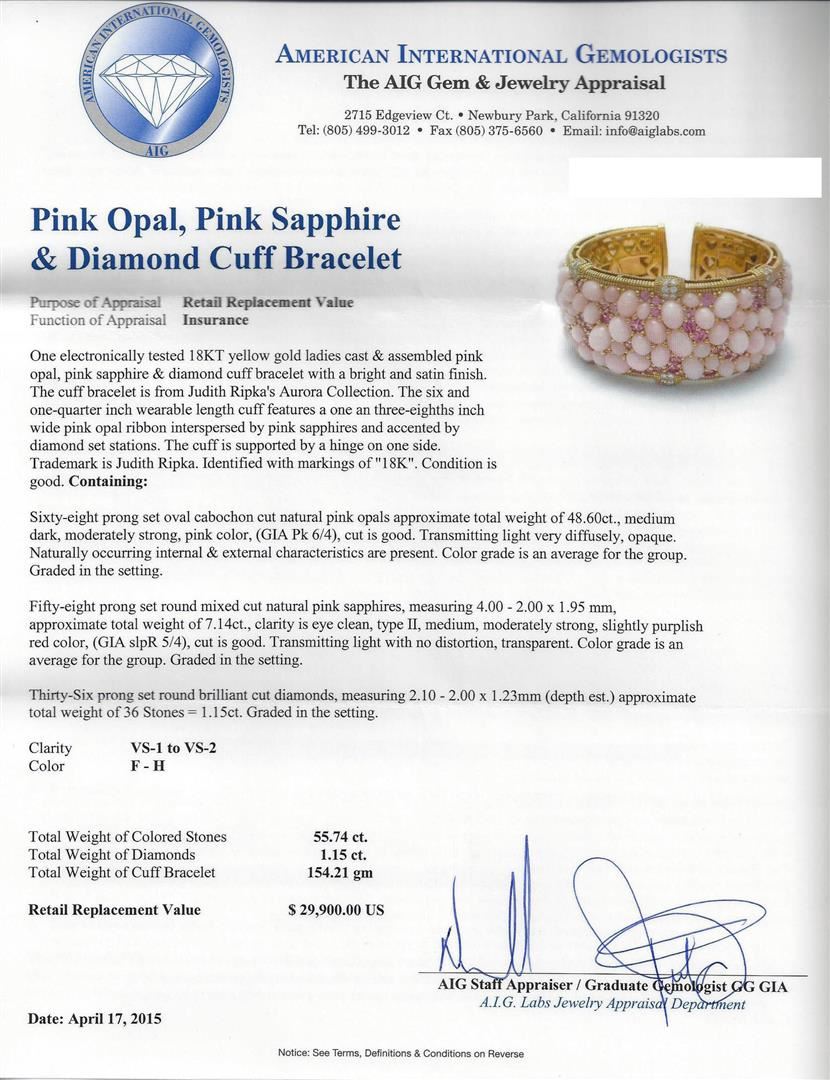 One electronically tested 18KT yellow gold ladies cast & assembled pink opal, pink sapphire & diamond cuff bracelet with a bright and satin finish. The cuff bracelet is from Judith Ripka's Aurora Collection. The six and one-quarter inch wearable length cuff features a one and three-eighths inch wide pink opal ribbon interspersed by pink sapphires and accented by diamond set stations. The cuff is supported by a hinge on one side. Trademark is Judith Ripka. Identified with markings of "18K". Condition is good. Containing: Sixty-eight prong set oval cabochon cut natural pink opals approximate total weight of 48.60ct., medium dark, moderately strong, pink color, (GIA Pk 6/4), cut is good. Transmitting light very diffusely, opaque. Naturally occurring internal & external characteristics are present. Color grade is an average for the group. Graded in the setting. Fifty-eight prong set round mixed cut natural pink sapphires, measuring 4.00 - 2.00 x 1.95 mm, approximate total weight of 7.14ct., clarity is eye clean, type II, medium, moderately strong, slightly purplish red color, (GIA slpR 5/4), cut is good. Transmitting light with no distortion, transparent. Color grade is an average for the group. Graded in the setting. Thirty-Six prong set round brilliant cut diamonds, measuring 2.10 - 2.00 x 1.23mm (depth est.) approximate total weight of 36 Stones = 1.15ct. Graded in the setting. Clarity: VS-1 to VS-2. Color: F - H. Total Weight of Colored Stones: 55.74 ct. Total Weight of Diamonds: 1.15 ct. Total Weight of Cuff Bracelet: 154.21 gm. AIG Appraised at $29,900.00.
