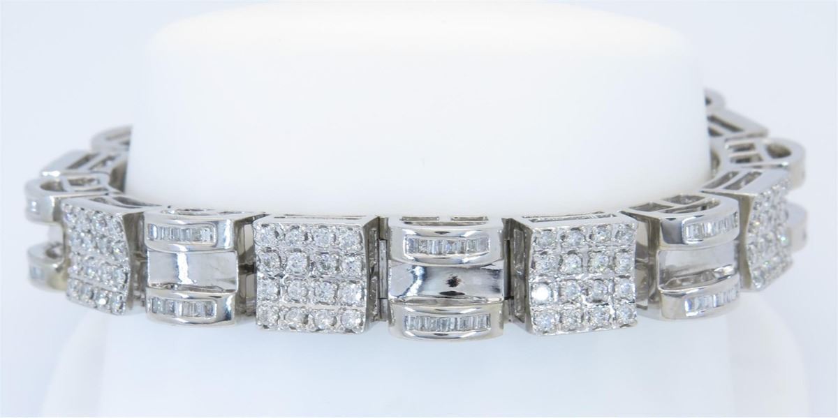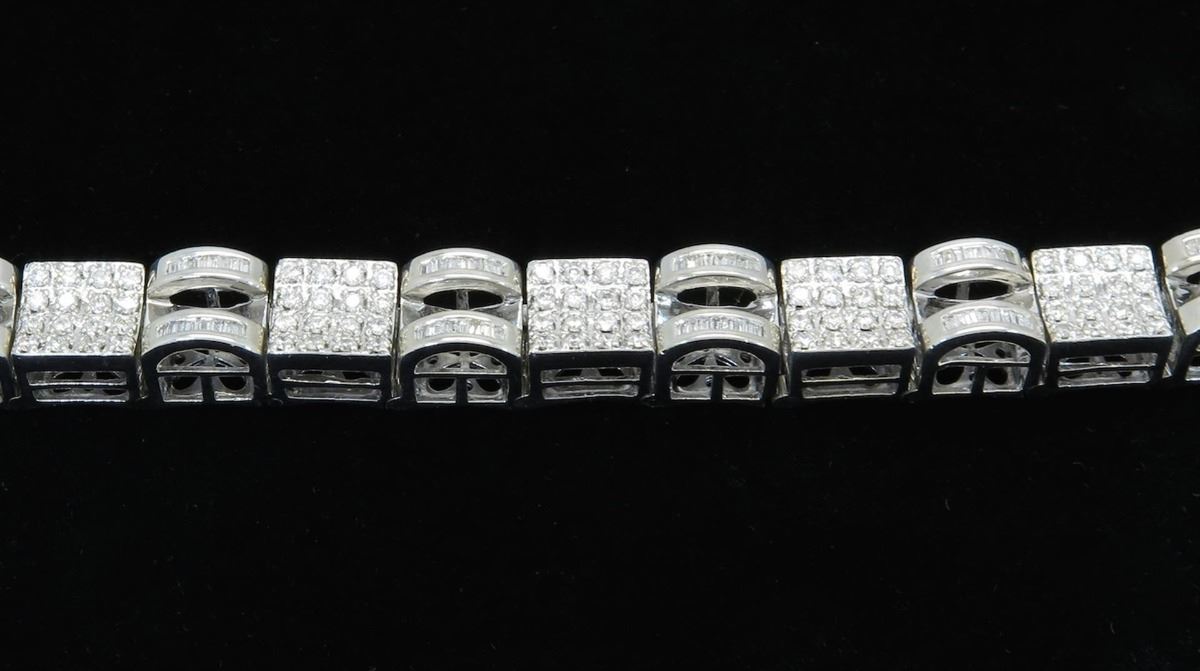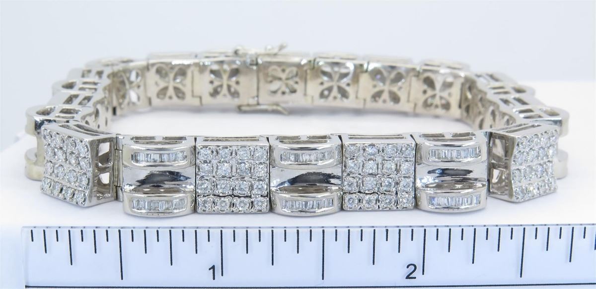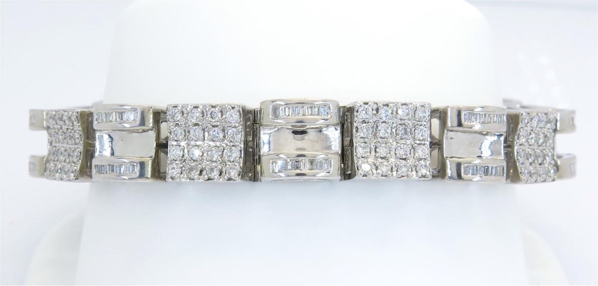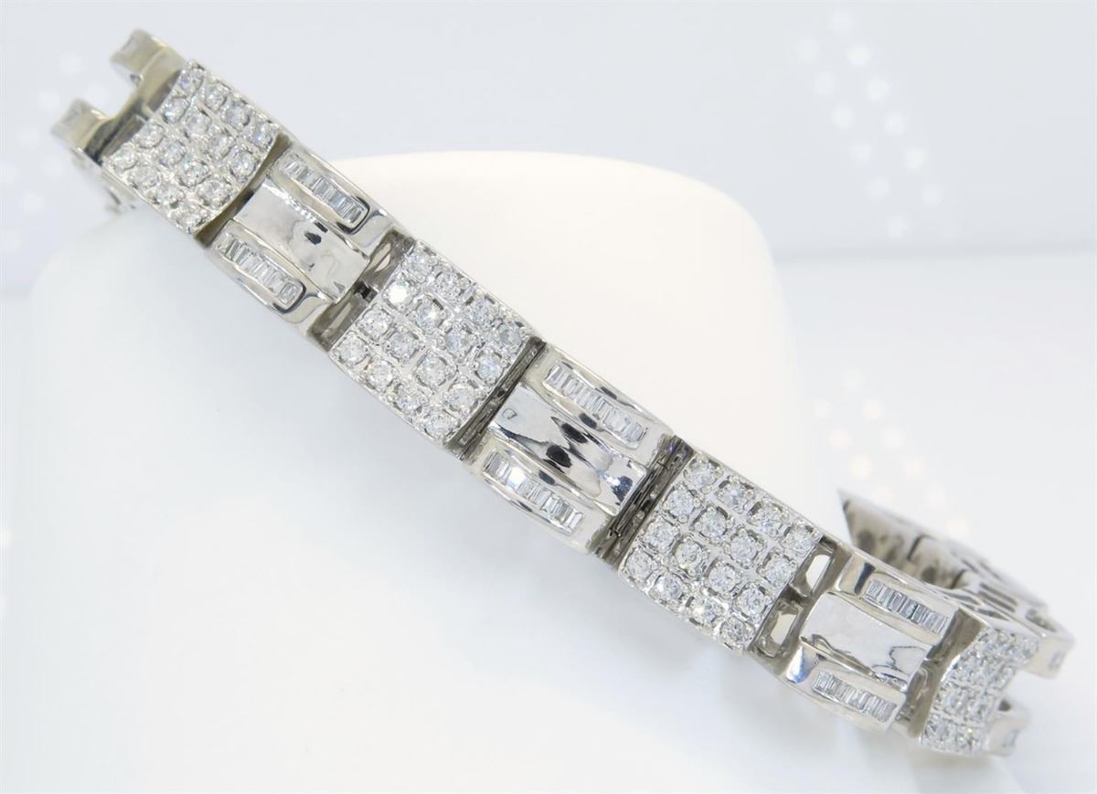 One tested 14K white gold mens diamond bracelet. Condition is new. Containing: 176 Round Brilliant Cut Diamonds, 176 Baguette Cut Diamonds. Clarity: I-SI, Color: G-H. Approximate Total diamond weight: 5CTW. Diamonds are graded in the mounting, unless otherwise stated. Weight of bracelet: 65.6 grams. Size: 8.5"