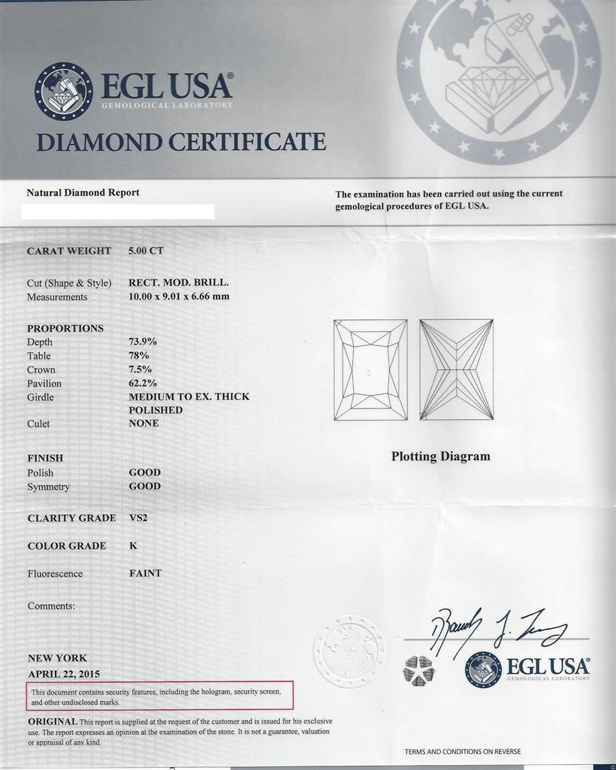 One electronically tested platinum lady's cast solitaire engagement ring with a cathedral shank with a bright polish finish. Condition is new. The featured ring has a 2.86mm shank. Identified with markings of "PLAT". Containing: One prong set princess cut diamond, measuring 10.00 x 9.01 x 6.66mm (depth est.) approximate weight of 5.00ct with a faint fluorescence. Graded in the setting. EGL USA Laboratory Report #US311161502D. Clarity: VS-2. Color: K. Cut: Good. Depth: 73.9%. Pavil. Depth%: 690.3%. Total Weight of Diamonds: 5.00ct. Total Weight of Ring: 9.10 gm. GAS Appraised at $155,925.00.