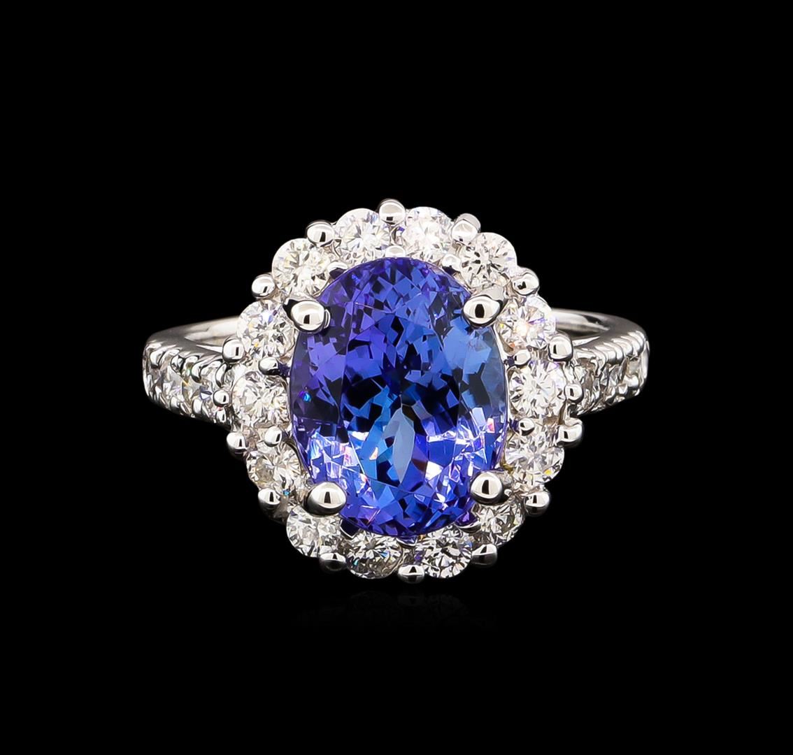 One electronically tested 14KT white gold lady's cast fashion ring with a basket halo with a bright polish finish. The featured lady's ring has a shank measuring 2.05 millimeters wide. Identified with markings of "14K". Condition is new, good workmanship. Containing: One prong set oval modified brilliant cut natural tanzanite, measuring 11.25 x 8.64 x 6.97mm, 5%. bulge factor, approximate weight of 5.00ct., clarity is eye clean, type I, medium dark, very slightly grayish, bluish violet color, (GIA bV 6/3), cut is very good. Transmitting light with no distortion, transparent. Colored gemstones are presumed to have been subjected to commonly used enhancement processes. Graded in the setting. Eight prong set round brilliant cut diamonds, measuring 2.10 - 2.00 x 1.27mm (depth est.) approximate total weight of 8 Stones = 0.26ct. Graded in the setting. Clarity: SI-1 to I-1. Color: G - Good Fourteen prong set round brilliant cut diamonds, measuring 2.40 - 2.30 x 1.46mm (depth est.) approximate total weight of 14 Stones = 0.69ct. Graded in the setting. Clarity: SI-1 to SI-2. Color: G - I. Cut Good. Total Weight of Colored Stones 5.00ct. Total Weight of Diamonds 0.95ct. Total Weight of Ring 6.20gm. GAS Appraised at $10,955.00.