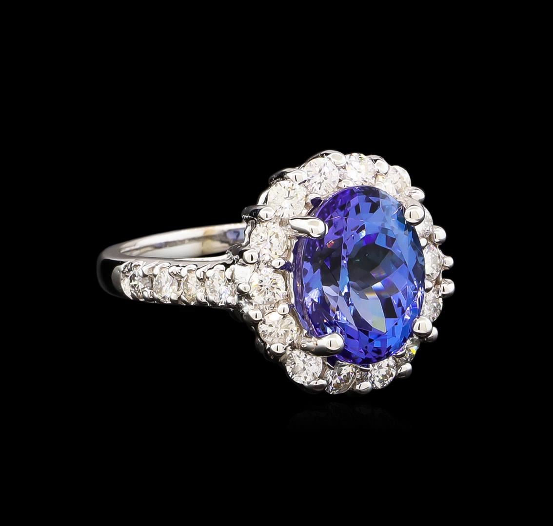 One electronically tested 14KT white gold lady's cast fashion ring with a basket halo with a bright polish finish. The featured lady's ring has a shank measuring 2.05 millimeters wide. Identified with markings of "14K". Condition is new, good workmanship. Containing: One prong set oval modified brilliant cut natural tanzanite, measuring 11.25 x 8.64 x 6.97mm, 5%. bulge factor, approximate weight of 5.00ct., clarity is eye clean, type I, medium dark, very slightly grayish, bluish violet color, (GIA bV 6/3), cut is very good. Transmitting light with no distortion, transparent. Colored gemstones are presumed to have been subjected to commonly used enhancement processes. Graded in the setting. Eight prong set round brilliant cut diamonds, measuring 2.10 - 2.00 x 1.27mm (depth est.) approximate total weight of 8 Stones = 0.26ct. Graded in the setting. Clarity: SI-1 to I-1. Color: G - Good Fourteen prong set round brilliant cut diamonds, measuring 2.40 - 2.30 x 1.46mm (depth est.) approximate total weight of 14 Stones = 0.69ct. Graded in the setting. Clarity: SI-1 to SI-2. Color: G - I. Cut Good. Total Weight of Colored Stones 5.00ct. Total Weight of Diamonds 0.95ct. Total Weight of Ring 6.20gm. GAS Appraised at $10,955.00.