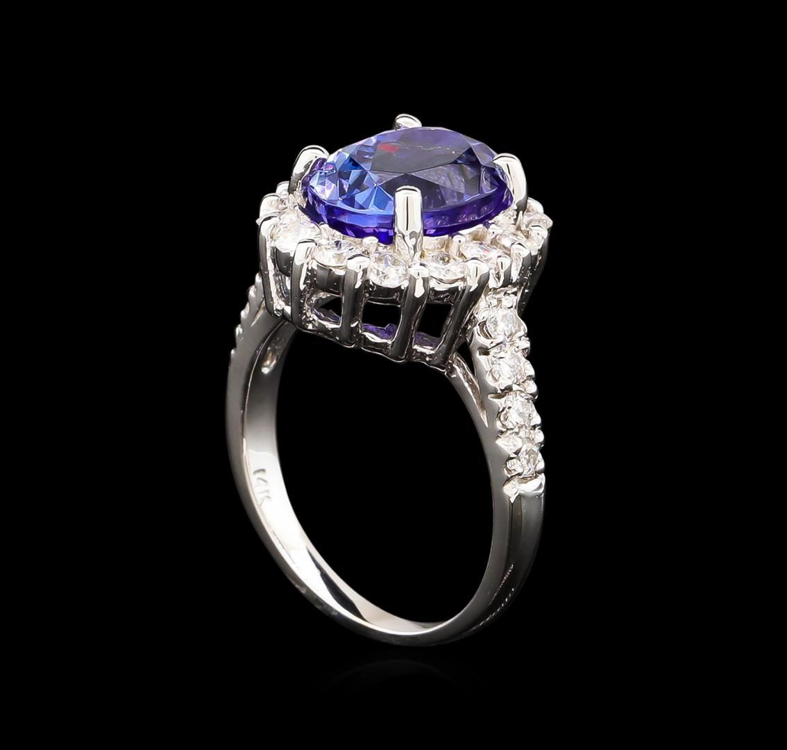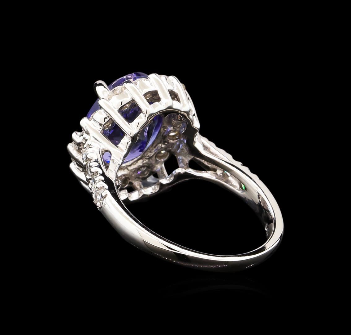 One electronically tested 14KT white gold lady's cast fashion ring with a basket halo with a bright polish finish. The featured lady's ring has a shank measuring 2.05 millimeters wide. Identified with markings of "14K". Condition is new, good workmanship. Containing: One prong set oval modified brilliant cut natural tanzanite, measuring 11.25 x 8.64 x 6.97mm, 5%. bulge factor, approximate weight of 5.00ct., clarity is eye clean, type I, medium dark, very slightly grayish, bluish violet color, (GIA bV 6/3), cut is very good. Transmitting light with no distortion, transparent. Colored gemstones are presumed to have been subjected to commonly used enhancement processes. Graded in the setting. Eight prong set round brilliant cut diamonds, measuring 2.10 - 2.00 x 1.27mm (depth est.) approximate total weight of 8 Stones = 0.26ct. Graded in the setting. Clarity: SI-1 to I-1. Color: G - Good Fourteen prong set round brilliant cut diamonds, measuring 2.40 - 2.30 x 1.46mm (depth est.) approximate total weight of 14 Stones = 0.69ct. Graded in the setting. Clarity: SI-1 to SI-2. Color: G - I. Cut Good. Total Weight of Colored Stones 5.00ct. Total Weight of Diamonds 0.95ct. Total Weight of Ring 6.20gm. GAS Appraised at $10,955.00.