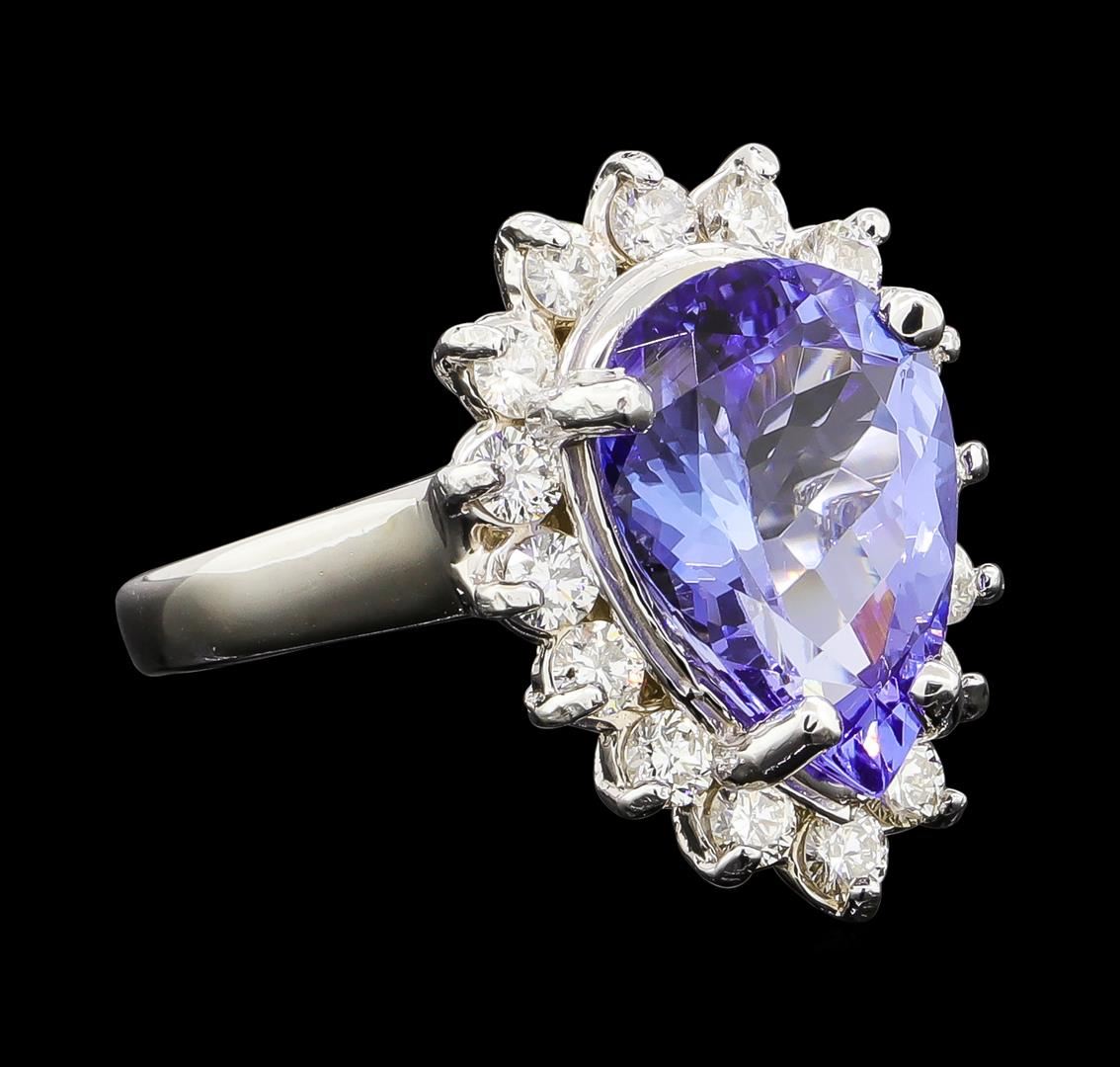 One electronically tested 14KT white gold lady's cast fashion ring with a basket halo with a bright polish finish. The featured lady's ring has a shank measuring 2.54 millimeters wide. Identified with markings of '14K'. Condition is new, good workmanship. Containing: One prong set pear modified brilliant cut natural tanzanite, measuring 13.97 x 9.95 x 5.86mm, (depth est.) approximate weight of 5.00ct., clarity is eye clean, medium, very slightly grayish, violet color, (GIA V 5/3), cut is good. Transmitting light with no distortion, transparent. Colored gemstones are presumed to have been subjected to commonly used enhancement processes. Graded in the setting. Sixteen prong set round brilliant cut diamonds, measuring 2.50 - 2.40 x 1.49mm (depth est.) approximate total weight of 16 Stones = 0.88ct. Graded in the setting. Clarity SI-1 to I-1. Color: H - I Cut Good. Total Weight of Colored Stones 5.00ct.. Total Weight of Diamonds 0.88ct.. Total Weight of Ring 7.30gm. GAS Appraised at $8,660.00.