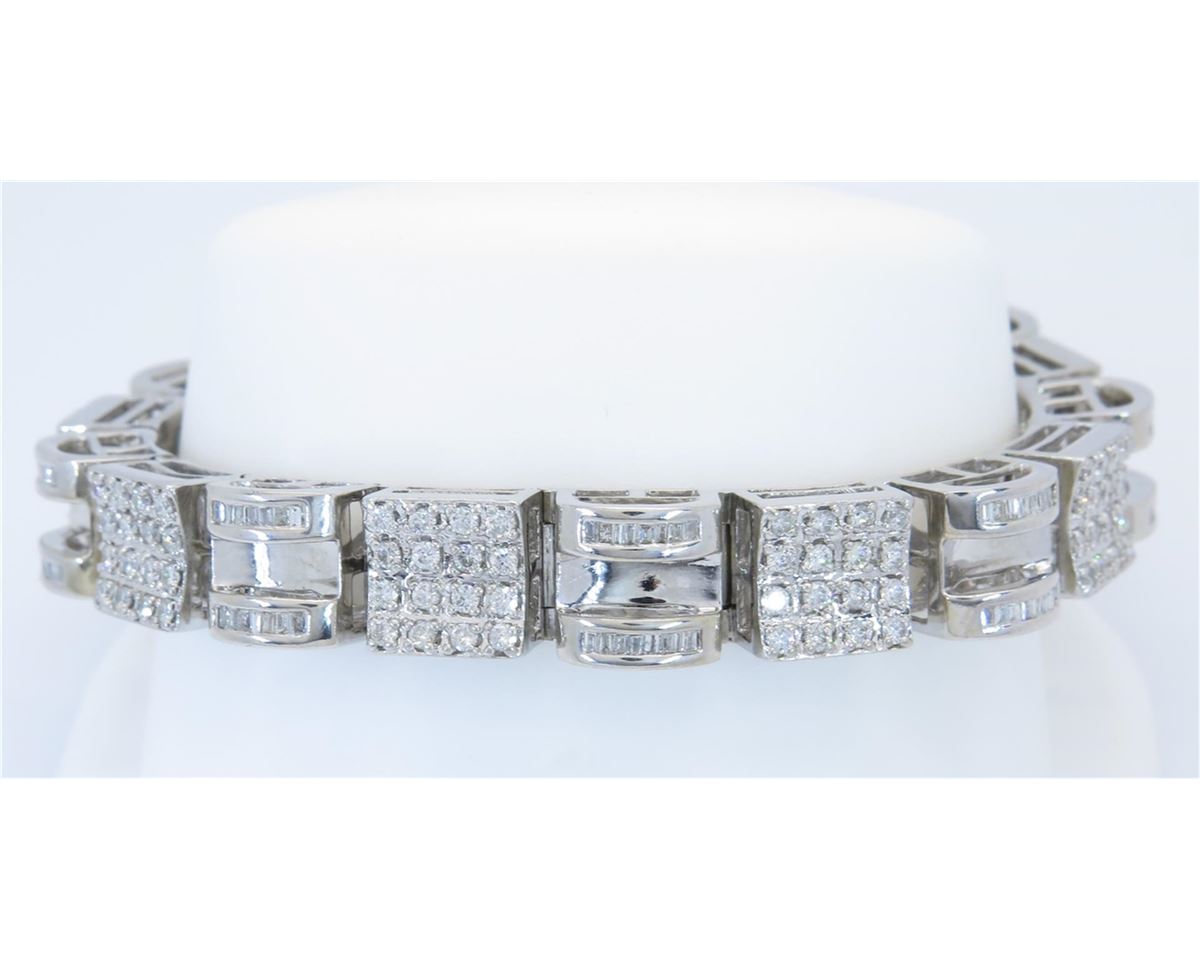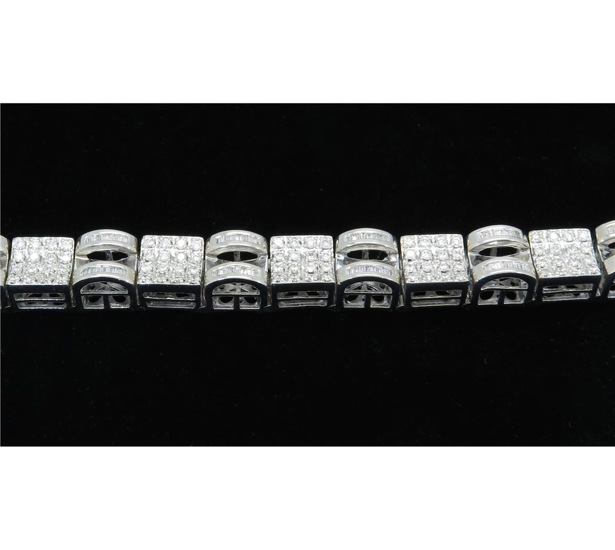 One tested 14K white gold mens diamond bracelet. Condition is new. Containing: 176 Round Brilliant Cut Diamonds, 176 Baguette Cut Diamonds. Clarity: I-SI, Color: G-H. Approximate Total diamond weight: 5CTW. Diamonds are graded in the mounting, unless otherwise stated. Weight of bracelet: 65.6 grams. Size: 8.5"