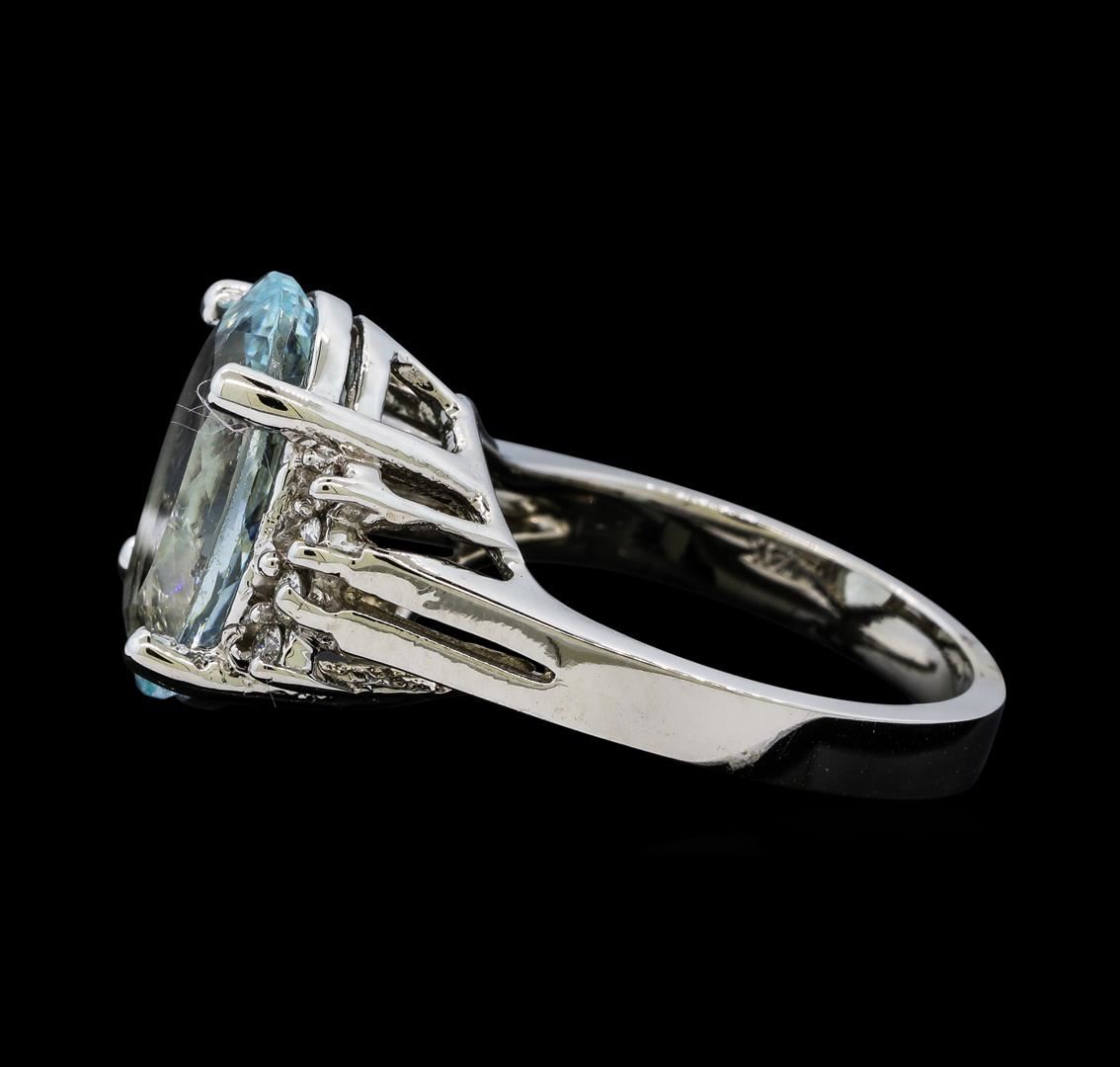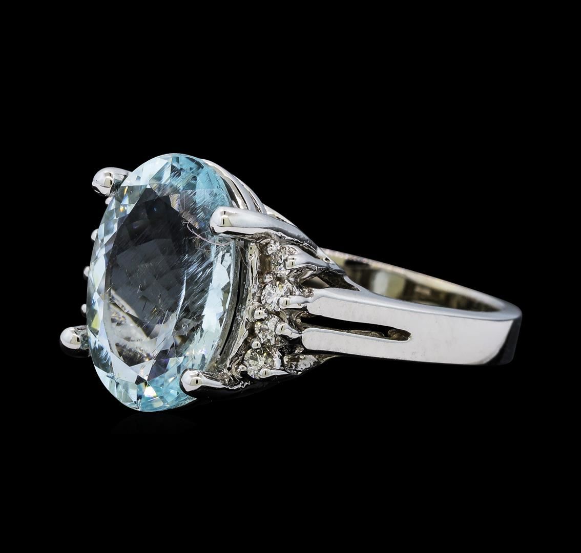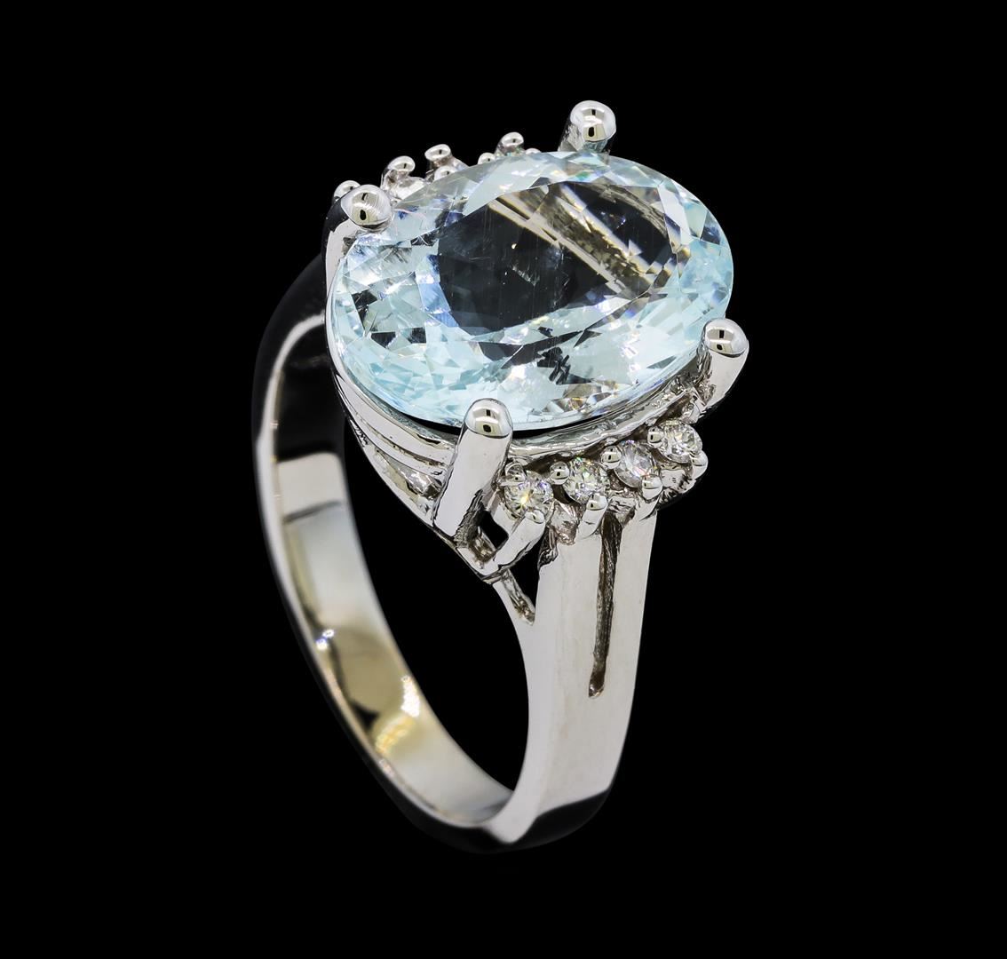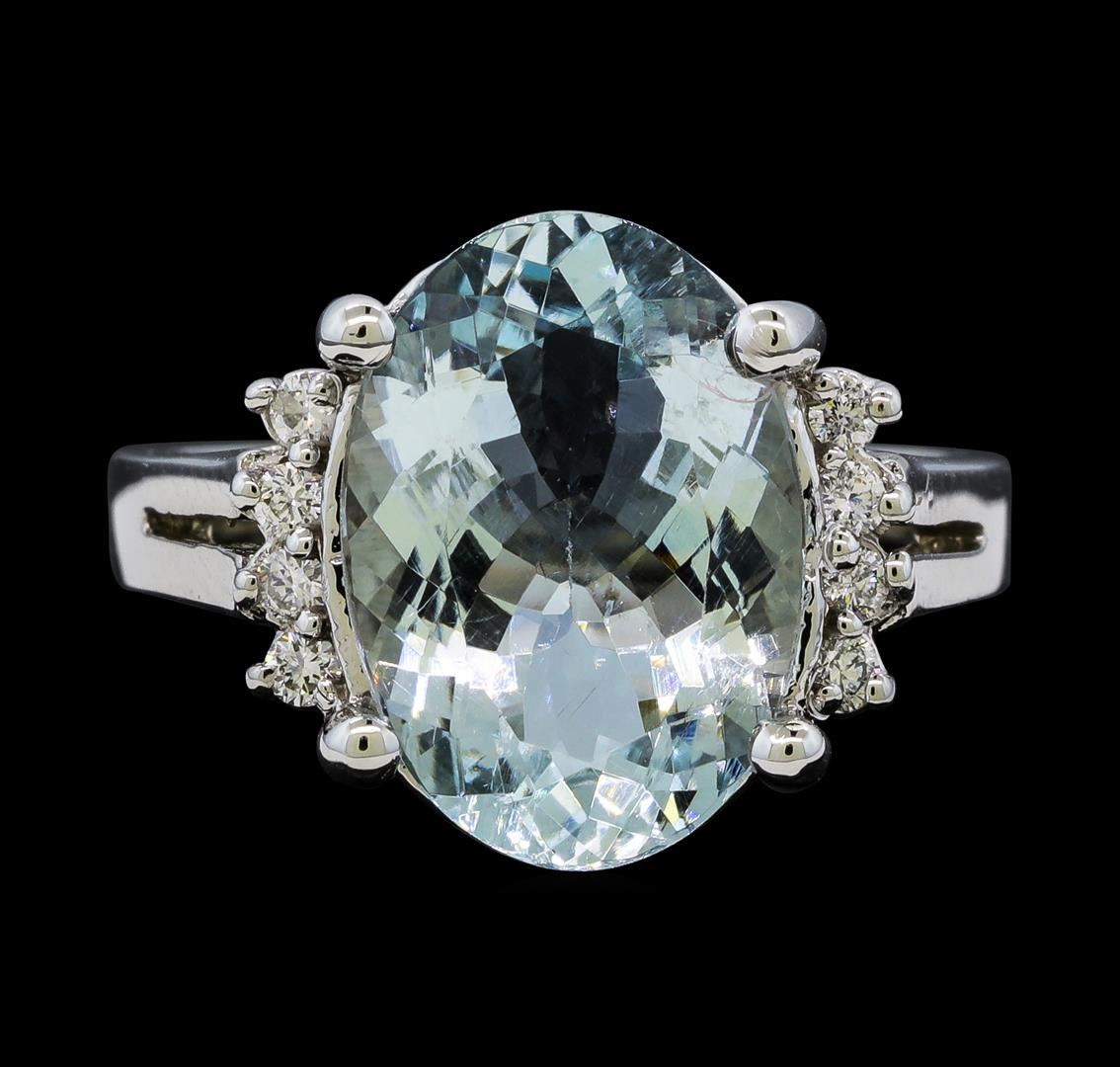 One Aquamarine and Diamond Ring including: 14KT White Gold weighing a total of 6.24 grams, Aquamarine weighing a total of 5.01ct, and 8 Diamonds weighing a total of 0.15ctw.
