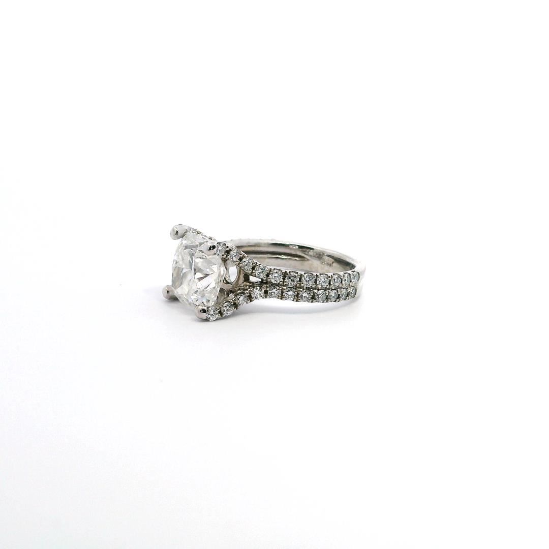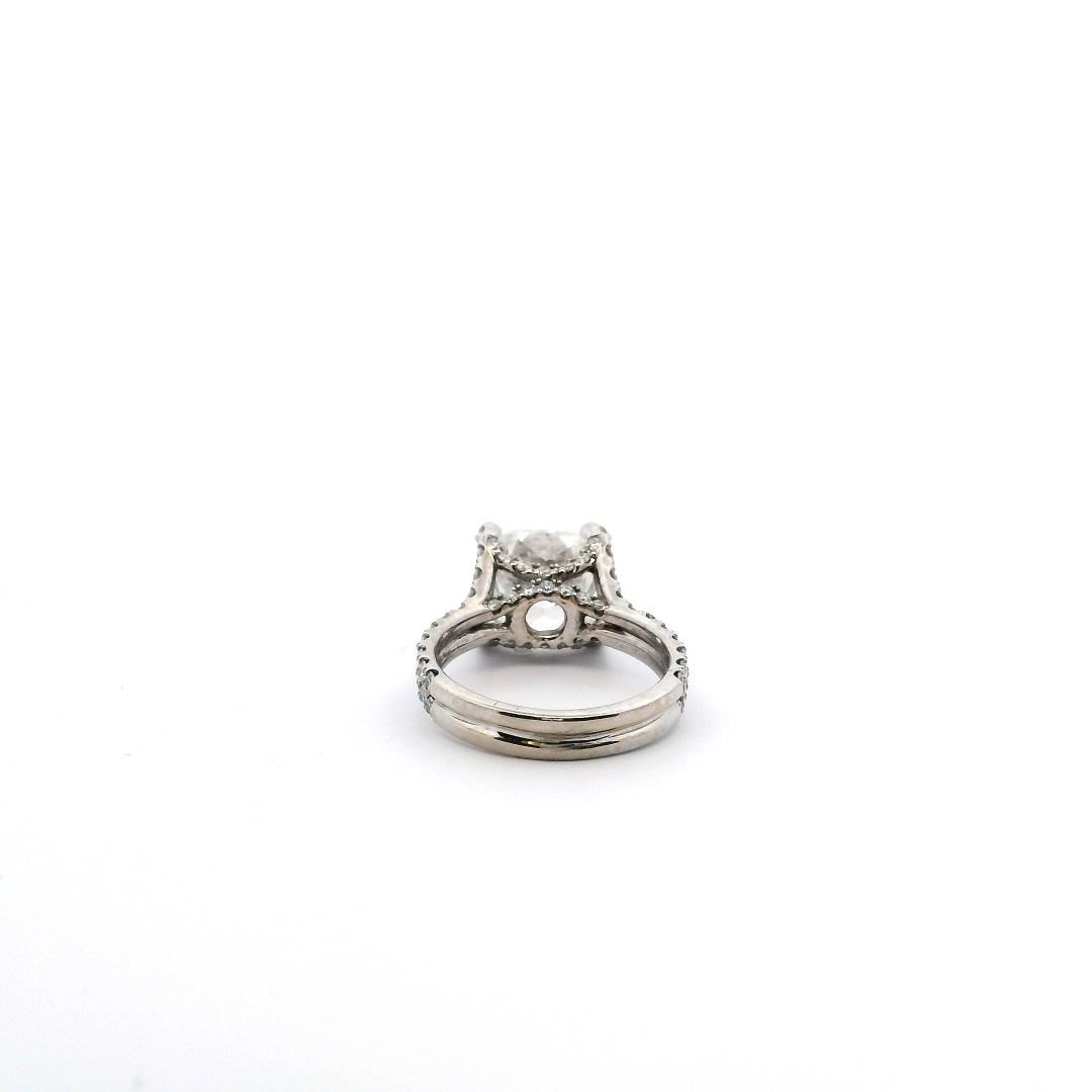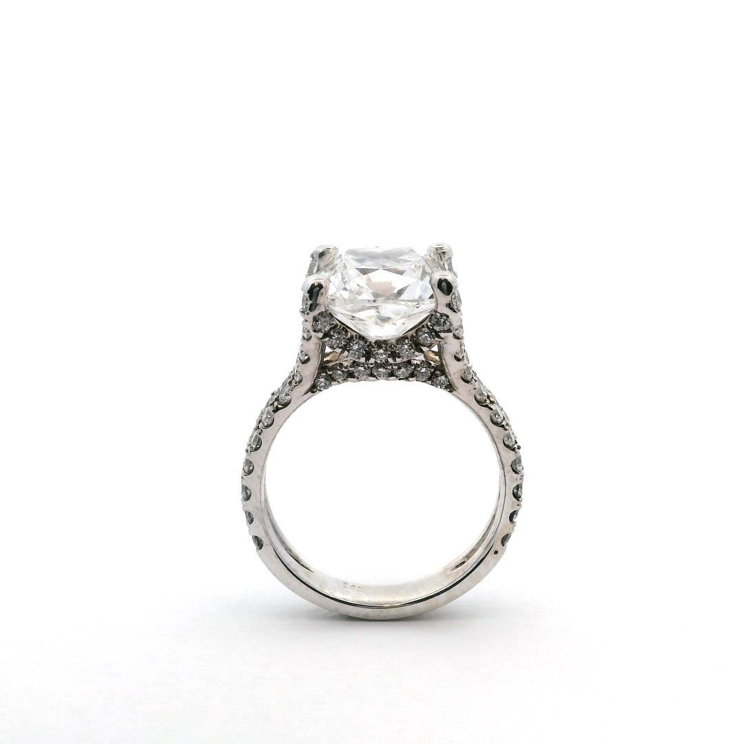 This ring features a stunning 4.01ct cushion cut diamond with SI-1 clarity and F color. Expert craftsmanship and EGL certified! One electronically tested 14KT white gold lady's cast split shank wedding ring with a diamond gallery with a bright polish finish. Condition is new, good workmanship. The featured lady's ring has a double shank measuring 3.60 millimeters in width. Identified with markings of 14K. Containing: One prong set cushion cut diamond, measuring 9.24 x 9.12 x 6.27mm (depth est.) approximate weight of 4.01ct. EGL USA Laboratory Report # US 925891501D. Color: F Clarity: SI-1 Cut: Very Good Forty-four prong set round brilliant cut diamonds, measuring 1.65 - 1.60 x 1.00mm (depth est.) approximate total weight of 44 Stones = 0.75ct. Graded in the setting. Color: G-H Clarity: VS-1 to SI-1 Cut: Very Good Twenty-eight prong set round brilliant cut diamonds, measuring 1.40 - 1.35 x 0.86mm (depth est.) approximate total weight of 28 Stones = 0.26ct. Graded in the setting. Color: F-G Clarity: VS-1 to SI-1 Cut: Very Good Total Weight of Diamonds: 5.02ct. Total Weight of Wedding Ring: 4.70gm Total Estimated Retail Value: $129480.00 Appraisal No: 000024214002