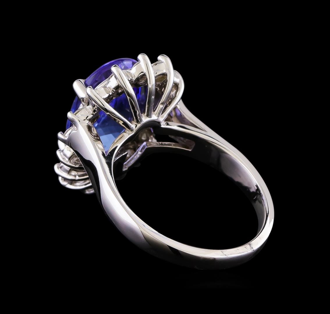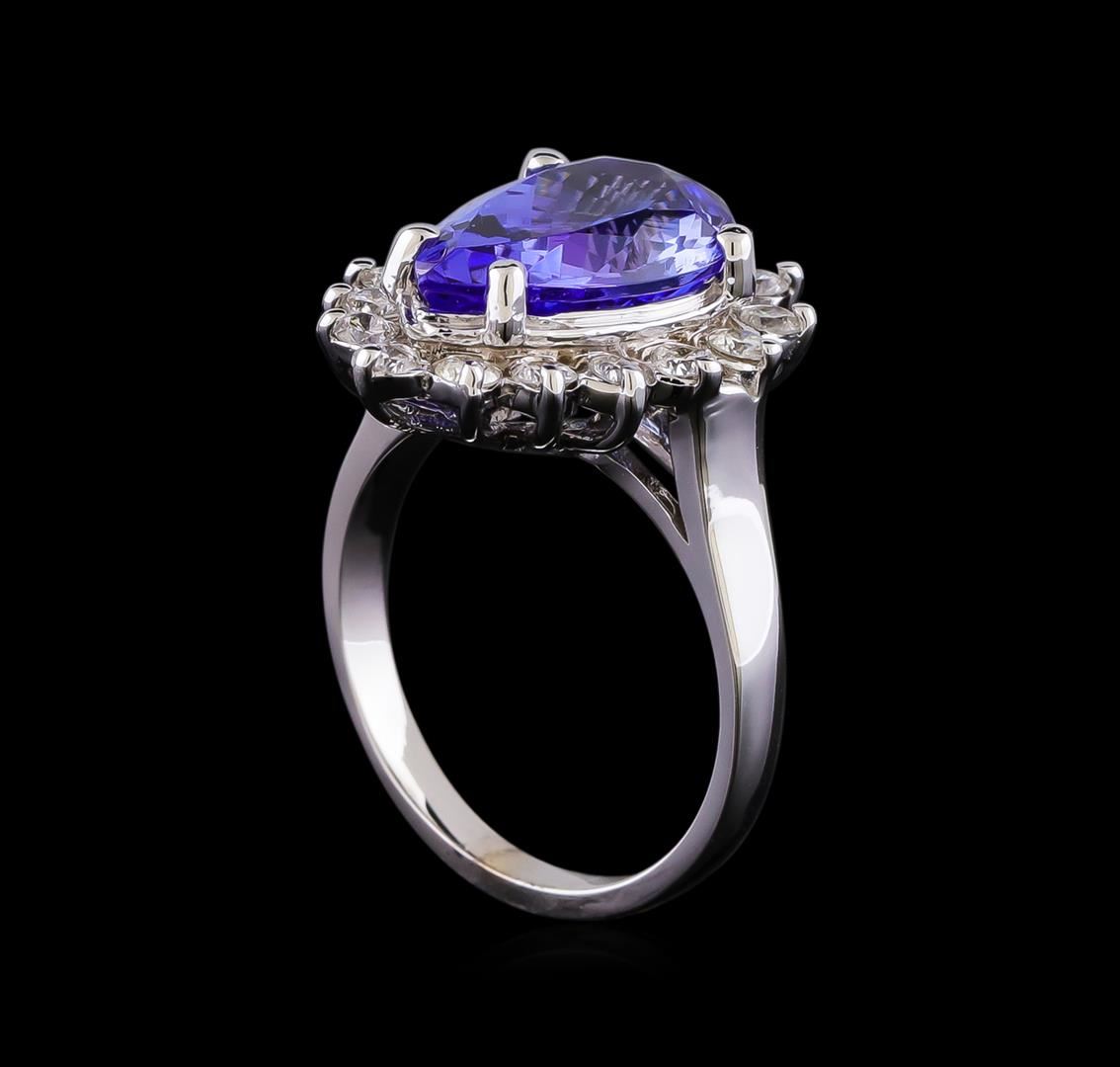 One electronically tested 14KT white gold lady's cast fashion ring with a cathedral basket halo with a bright polish finish. The featured lady's has a shank measuring 2.35 millimeters in width. Identified with markings of "14K". Condition is new, good workmanship. Containing: One prong set pear modified brilliant cut natural tanzanite, measuring 14.59 x 8.82 x 5.73mm, (depth est.) approximate weight of 5.02ct., clarity is eye clean, medium light, moderately strong, bluish violet color, (GIA bV 4/4), cut is very good. Transmitting light with no distortion, transparent. Colored gemstones are presumed to have been subjected to commonly used enhancement processes. Graded in the setting. Sixteen prong set round brilliant cut diamonds, measuring 2.35 - 2.25 x 1.44mm (depth est.) approximate total weight of 16 Stones = 0.76ct. Graded in the setting. Clarity: VS-2 to SI-2. Color: H - I. Cut Good. Total Weight of Colored Stones 5.02ct. Total Weight of Diamonds 0.76ct. Total Weight of Ring 6.60gm. GAS Appraised.