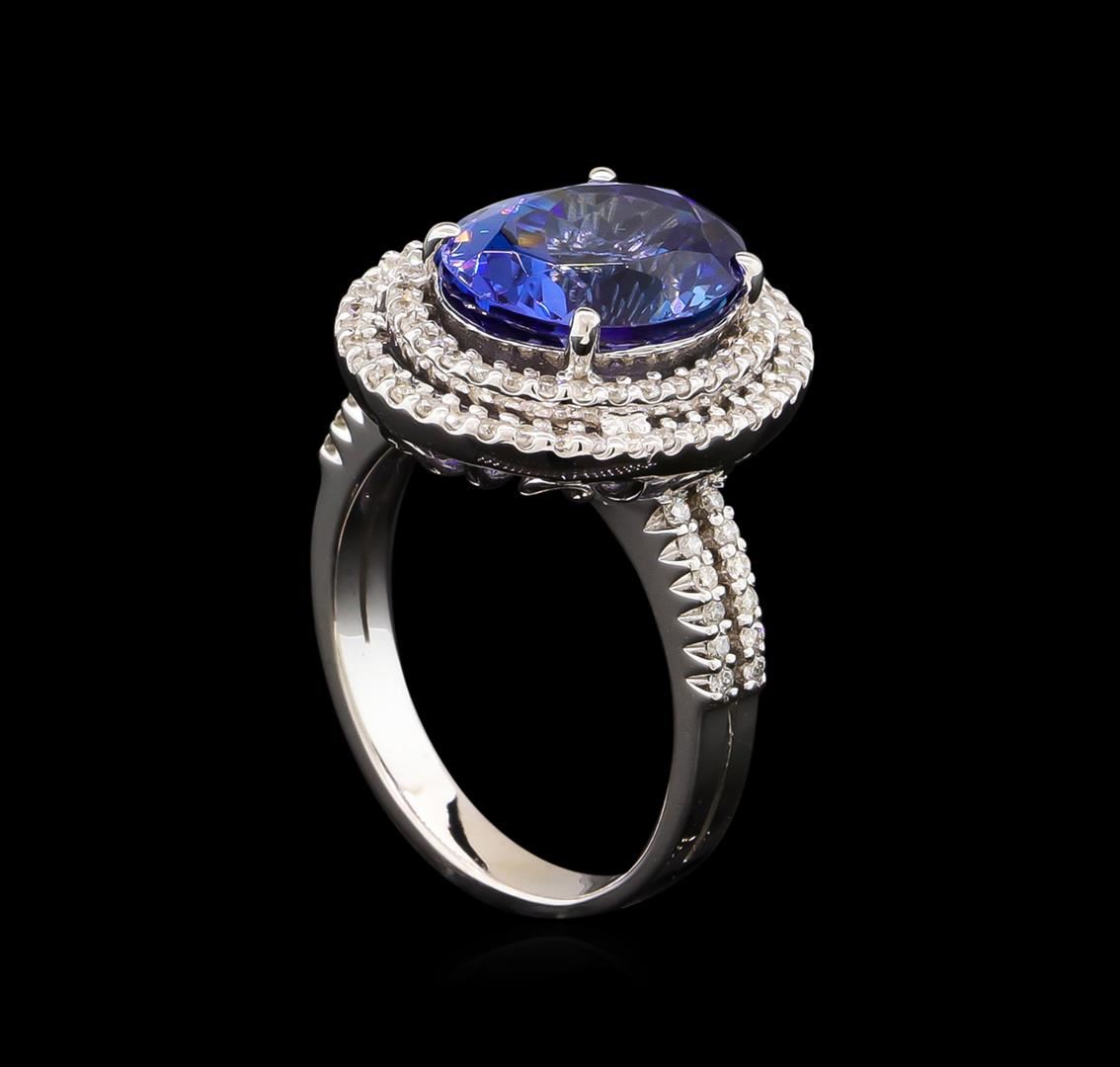 One electronically tested 14KT white gold lady's cast fashion ring with a double basket halo with a bright polish finish. The featured lady's ring has a shank measuring 2.77 millimeters wide. Identified with markings of "K14". Condition is new, good workmanship. Containing: One prong set oval modified brilliant cut natural tanzanite, measuring 11.68 x 9.32 x 6.62mm, approximate weight of 5.02ct., clarity is eye clean, type I, medium, moderately strong, bluish violet color, (GIA bV 5/4), cut is very good. Transmitting light with no distortion, transparent. Colored gemstones are presumed to have been subjected to commonly used enhancement processes. Graded in the setting. One Hundred prong set round brilliant cut diamonds, measuring 1.10 - 1.05 x 0.67mm (depth est.) approximate total weight of 100 Stones = 0.48ct. Graded in the setting. Clarity: SI-2 to I-1. Color: G - I. Cut Good. Total Weight of Colored Stones 5.02ct. Total Weight of Diamonds 0.48ct. Total Weight of Ring 6.80gm. GAS Appraised at $10,675.00.