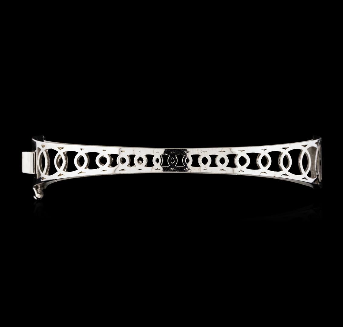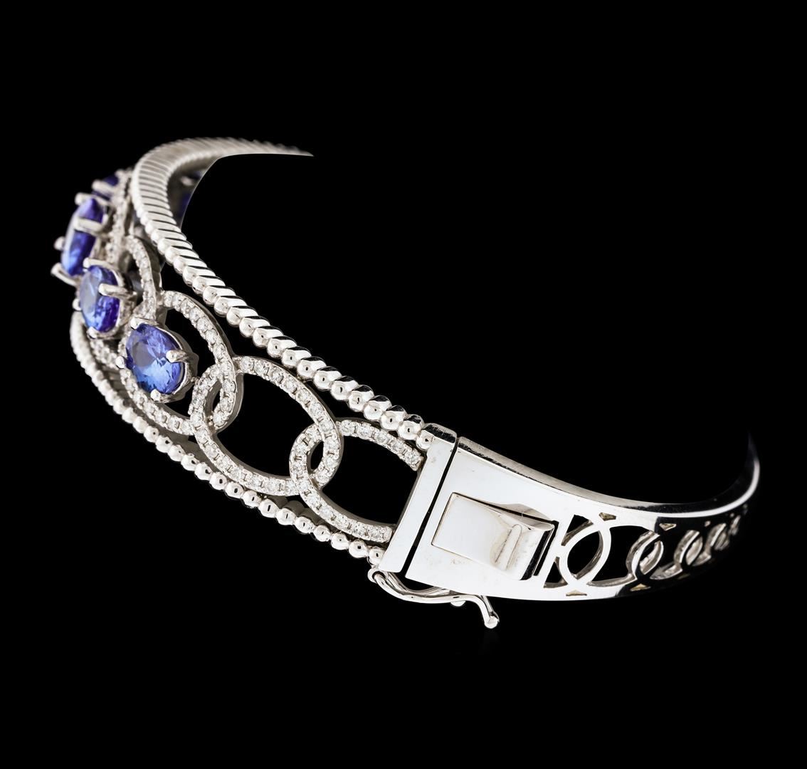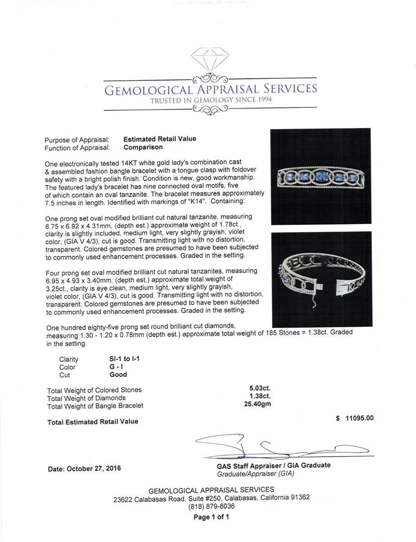 One electronically tested 14KT white gold lady's combination cast & assembled fashion bangle bracelet with a tongue clasp with foldover safety with a bright polish finish. The featured lady's bracelet has nine connected oval motifs, five of which contain an oval tanzanite. The bracelet measures approximately 7.5 inches in length. Identified with markings of 'K14'. Condition is new, good workmanship. Containing: One prong set oval modified brilliant cut natural tanzanite, measuring 8.75 x 6.92 x 4.31mm, (depth est.) approximate weight of 1.78ct., clarity is slightly included, medium light, very slightly grayish, violet color, (GIA V 4/3), cut is good. Transmitting light with no distortion, transparent. Colored gemstones are presumed to have been subjected to commonly used enhancement processes. Graded in the setting. Four prong set oval modified brilliant cut natural tanzanites, measuring 6.95 x 4.93 x 3.40mm, (depth est.) approximate total weight of 3.25ct., clarity is eye clean, medium light, very slightly grayish, violet color, (GIA V 4/3), cut is good. Transmitting light with no distortion, transparent. Colored gemstones are presumed to have been subjected to commonly used enhancement processes. Graded in the setting. One Hundred Eighty-Five prong set round brilliant cut diamonds, measuring 1.30 - 1.20 x 0.78mm (depth est.) approximate total weight of 185 Stones = 1.38ct. Graded in the setting. Clarity SI-1 to I-1. Color: G - I Cut Good. Total Weight of Colored Stones 5.03ct.. Total Weight of Diamonds 1.38ct.. Total Weight of Bangle Bracelet 25.40gm. GAS Appraised at $11,095.00.