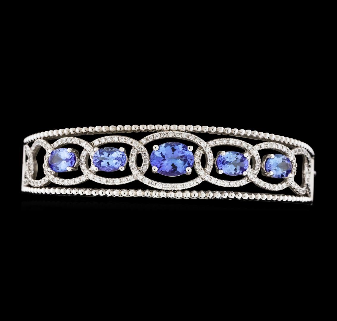 One electronically tested 14KT white gold lady's combination cast & assembled fashion bangle bracelet with a tongue clasp with foldover safety with a bright polish finish. The featured lady's bracelet has nine connected oval motifs, five of which contain an oval tanzanite. The bracelet measures approximately 7.5 inches in length. Identified with markings of 'K14'. Condition is new, good workmanship. Containing: One prong set oval modified brilliant cut natural tanzanite, measuring 8.75 x 6.92 x 4.31mm, (depth est.) approximate weight of 1.78ct., clarity is slightly included, medium light, very slightly grayish, violet color, (GIA V 4/3), cut is good. Transmitting light with no distortion, transparent. Colored gemstones are presumed to have been subjected to commonly used enhancement processes. Graded in the setting. Four prong set oval modified brilliant cut natural tanzanites, measuring 6.95 x 4.93 x 3.40mm, (depth est.) approximate total weight of 3.25ct., clarity is eye clean, medium light, very slightly grayish, violet color, (GIA V 4/3), cut is good. Transmitting light with no distortion, transparent. Colored gemstones are presumed to have been subjected to commonly used enhancement processes. Graded in the setting. One Hundred Eighty-Five prong set round brilliant cut diamonds, measuring 1.30 - 1.20 x 0.78mm (depth est.) approximate total weight of 185 Stones = 1.38ct. Graded in the setting. Clarity SI-1 to I-1. Color: G - I Cut Good. Total Weight of Colored Stones 5.03ct.. Total Weight of Diamonds 1.38ct.. Total Weight of Bangle Bracelet 25.40gm. GAS Appraised at $11,095.00.