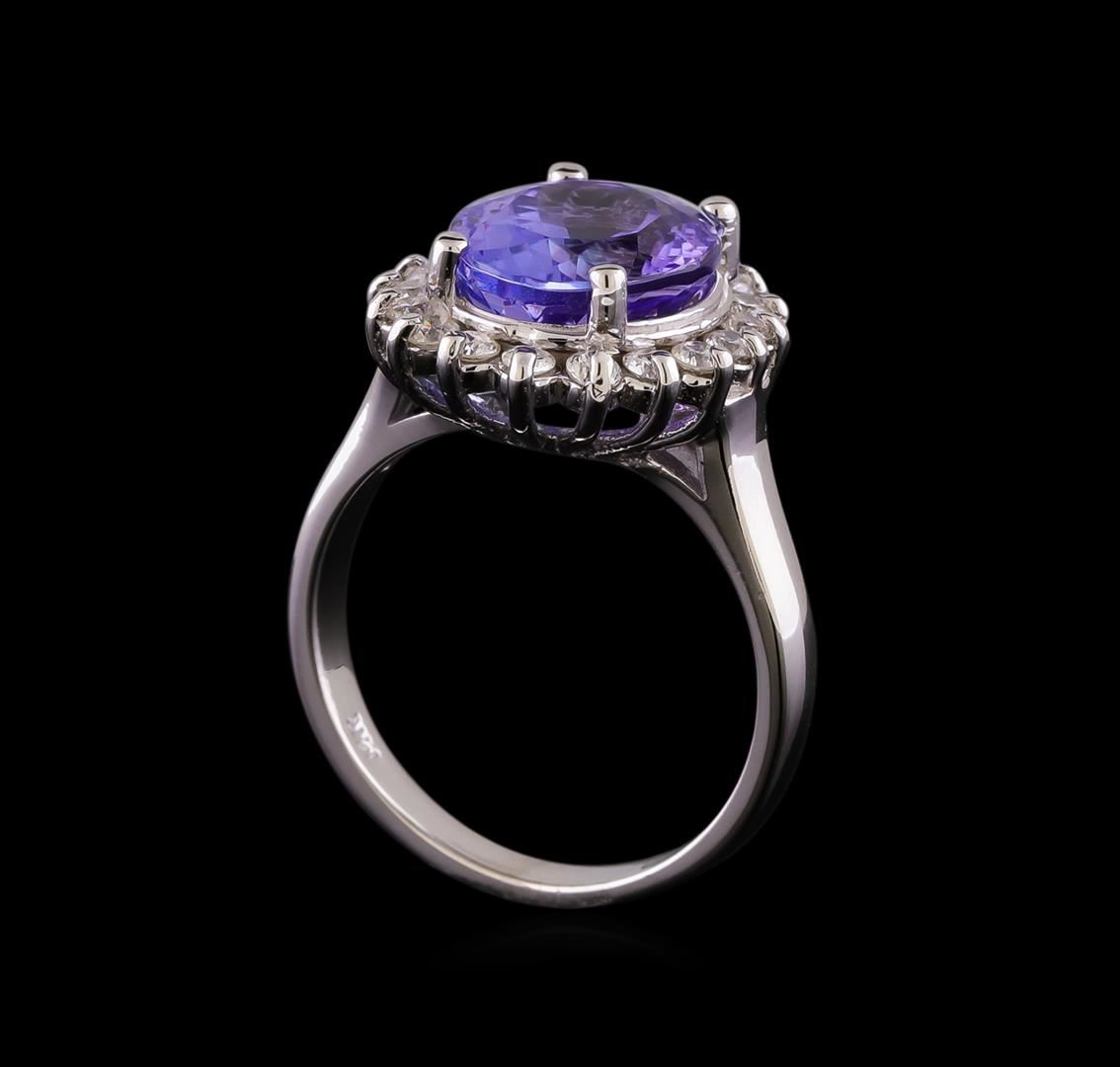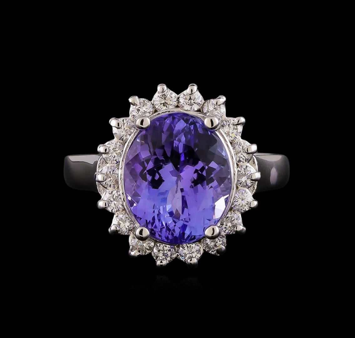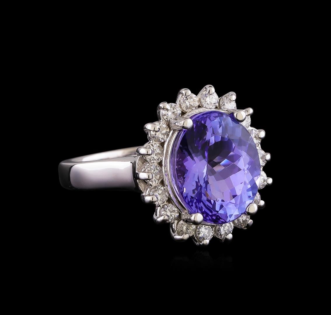 One electronically tested 14KT white gold lady's cast fashion ring with a basket halo with a bright polish finish. The featured lady's ring has a shank measuring 2.36 millimeters wide. Identified with markings of "14K". Condition is new, good workmanship. Containing: One prong set oval modified brilliant cut natural tanzanite, measuring 11.39 x 9.36 x 6.68mm, (depth est.) approximate weight of 5.03ct., clarity is eye clean, medium light, moderately strong, bluish violet color, (GIA bV 4/4), cut is very good. Transmitting light with no distortion, transparent. Colored gemstones are presumed to have been subjected to commonly used enhancement processes. Graded in the setting. Eighteen prong set round brilliant cut diamonds, measuring 2.00 - 1.90 x 1.21mm (depth est.) approximate total weight of 18 Stones = 0.51ct. Graded in the setting. Clarity: SI-1 to SI-2. Color: H - I. Cut Good. Total Weight of Colored Stones 5.03ct. Total Weight of Diamonds 0.51ct. Total Weight of Ring 6.40gm. GAS Appraised at $8,815.00.
