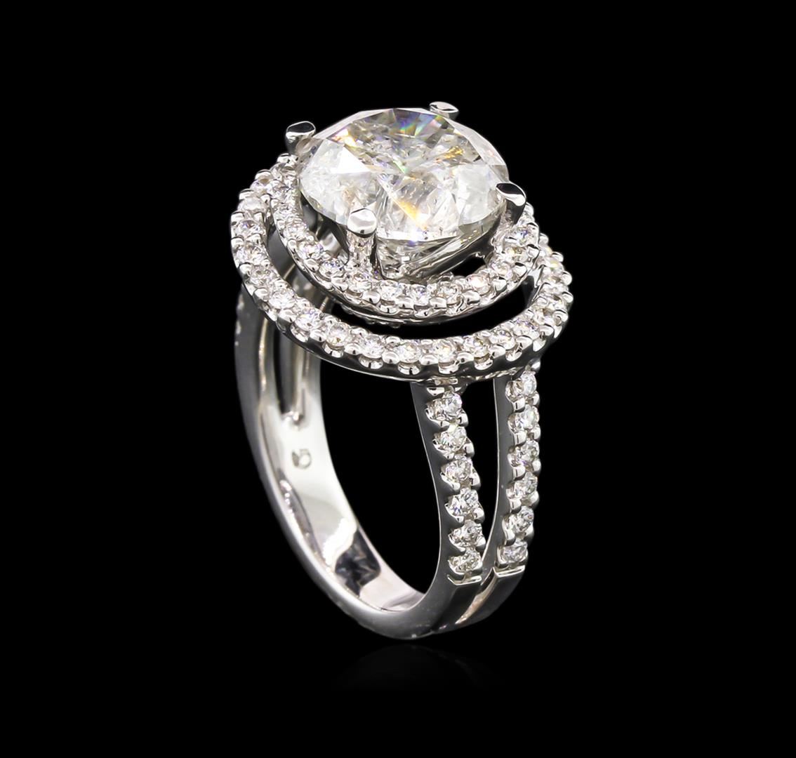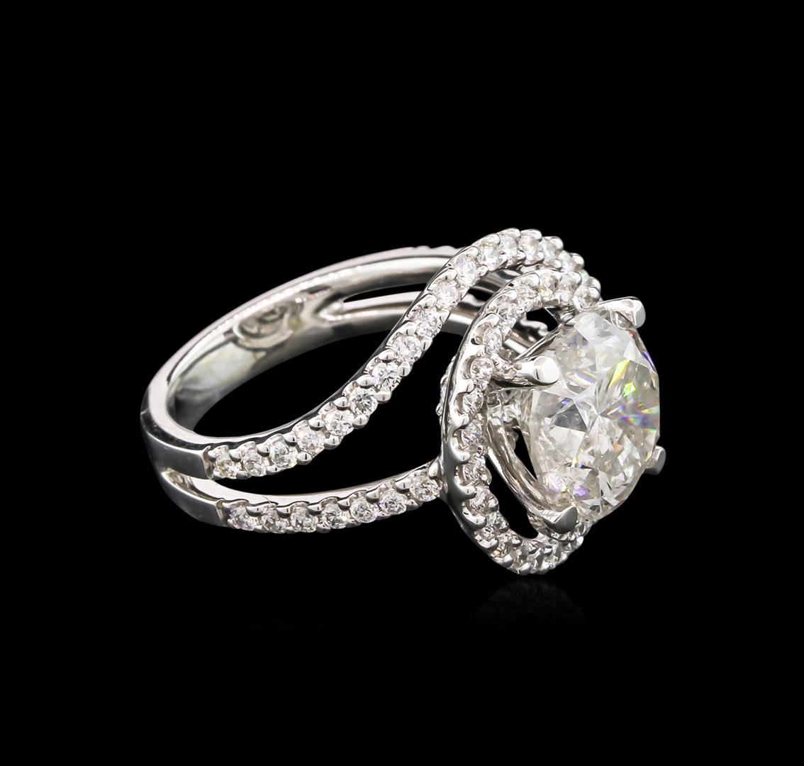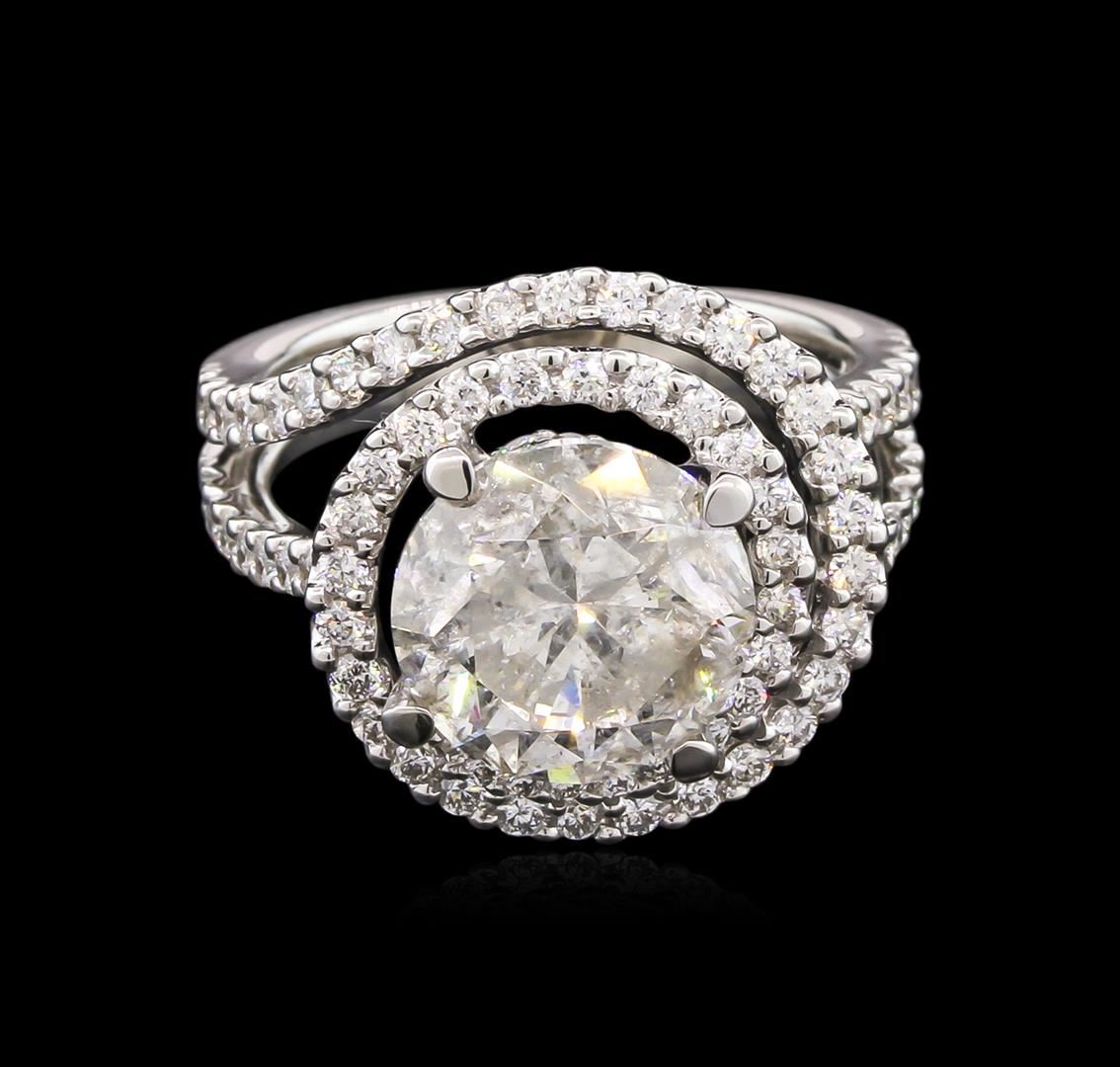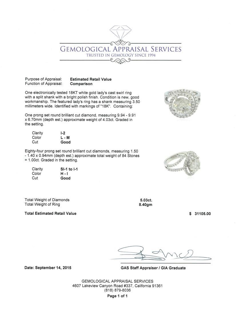 One electronically tested 18KT white gold lady's cast swirl ring with a split shank with a bright polish finish. The featured lady's ring has a shank measuring 3.50 millimeters wide. Identified with markings of "18K". Condition is new, good workmanship. Containing: One prong set round brilliant cut diamond, measuring 9.94 - 9.91 x 6.70mm (depth est.) approximate weight of 4.03ct. Graded in the setting. Clarity: I-2. Color: L - M. Cut Good Eighty-Four prong set round brilliant cut diamonds, measuring 1.50 - 1.40 x 0.94mm (depth est.) approximate total weight of 84 Stones = 1.00ct. Graded in the setting. Clarity: SI-1 to I-1. Color: H - I. Cut Good. Total Weight of Diamonds 5.03ct. Total Weight of Ring 8.40gm. GAS Appraised at $31,105.00.