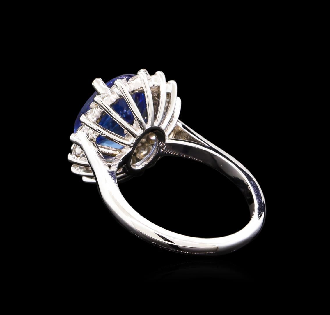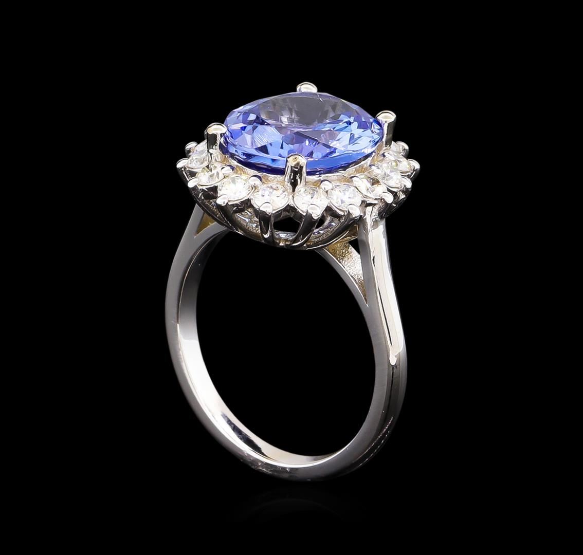 One electronically tested 14KT white gold lady's cast fashion ring with a basket halo with a bright polish finish. The featured lady's ring has a shank measuring 2.15 millimeters wide. Identified with markings of "14K". Condition is new, good workmanship. Containing: One prong set oval modified brilliant cut natural tanzanite, measuring 12.09 x 10.14 x 5.40mm, 8%. bulge factor, approximate weight of 5.04ct., clarity is eye clean, type I, medium light, moderately strong, bluish violet color, (GIA bV 4/4), cut is very good. Transmitting light with no distortion, transparent. Colored gemstones are presumed to have been subjected to commonly used enhancement processes. Graded in the setting. Sixteen prong set round brilliant cut diamonds, measuring 2.40 - 2.30 x 1.46mm (depth est.) approximate total weight of 16 Stones = 0.78ct. Graded in the setting. Clarity: SI-1 to SI-2. Color: G - I. Cut Good. Total Weight of Colored Stones 5.04ct. Total Weight of Diamonds 0.78ct. Total Weight of Ring 6.30gm. GAS Appraised at $9,345.00.