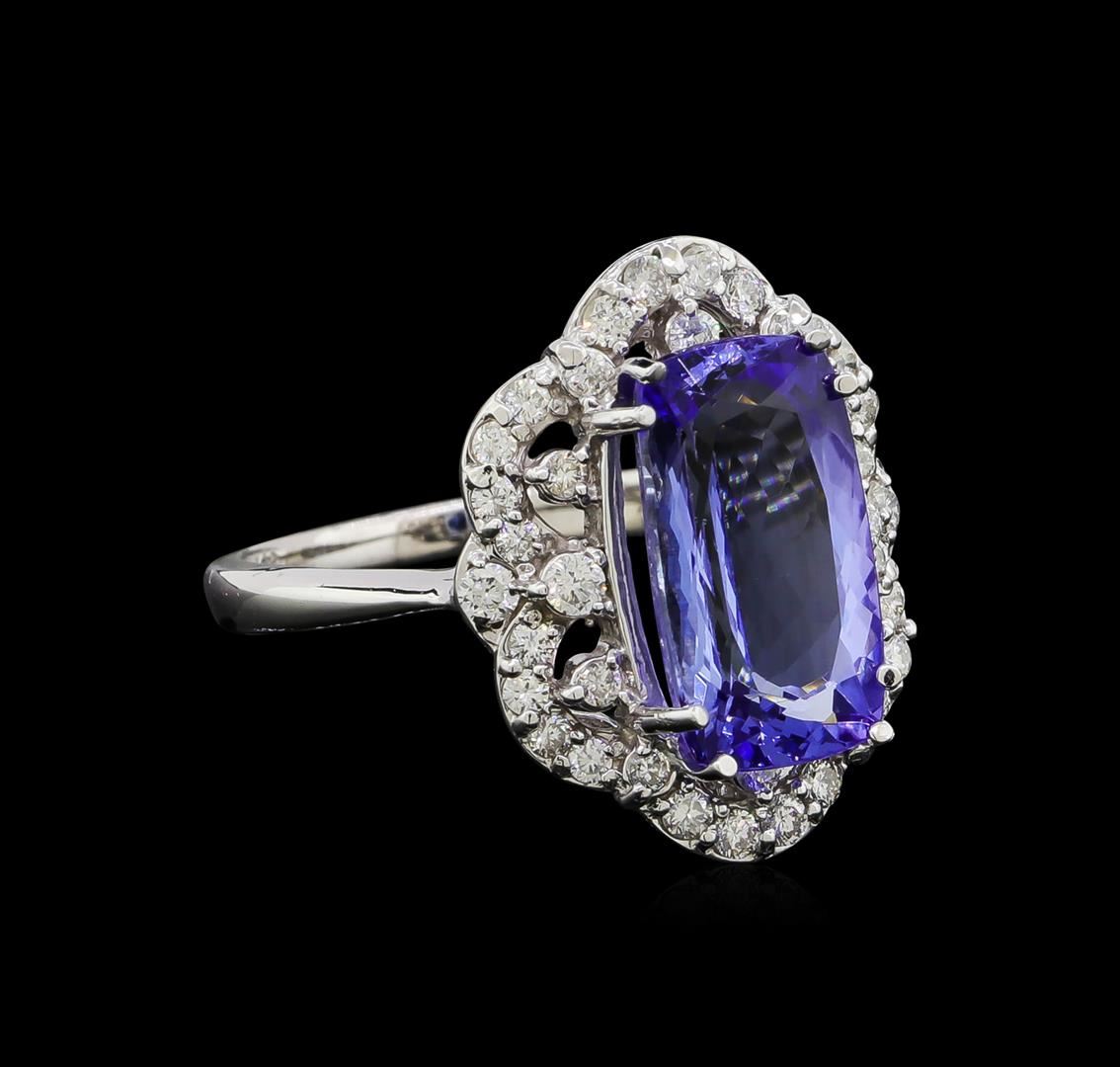 One electronically tested 14KT white gold lady's cast fashion ring with a scalloped basket halo with a bright polish finish. The featured lady's ring has a shank measuring 1.75 millimeters wide. Identified with markings of 'K14'. Condition is new, good workmanship. Containing: One prong set rectangular cushion modified brilliant cut natural tanzanite, measuring 13.53 x 7.68 x 5.38mm, (depth est.) 15%. bulge factor, approximate weight of 5.04ct., clarity is eye clean, medium light, moderately strong, violetish blue color, (GIA vB 4/4), cut is very good. Transmitting light with no distortion, transparent. Colored gemstones are presumed to have been subjected to commonly used enhancement processes. Graded in the setting. Four prong set round brilliant cut diamonds, measuring 2.05 - 1.95 x 1.24mm (depth est.) approximate total weight of 4 Stones = 0.12ct. Graded in the setting. Clarity SI-1 to SI-2. Color: H - I Cut Very Good Ten prong set round brilliant cut diamonds, measuring 1.75 - 1.65 x 1.02mm (depth est.) approximate total weight of 10 Stones = 0.18ct. Graded in the setting. Clarity SI-1 to I-1. Color: H - I Cut Good Thirty-Two prong set round brilliant cut diamonds, measuring 1.50 - 1.40 x 0.90mm (depth est.) approximate total weight of 32 Stones = 0.38ct. Graded in the setting. Clarity SI-1 to I-1. Color: H - I Cut Good. Total Weight of Colored Stones 5.04ct.. Total Weight of Diamonds 0.68ct.. Total Weight of Ring 6.20gm GAS Appraised at $9,405.00.