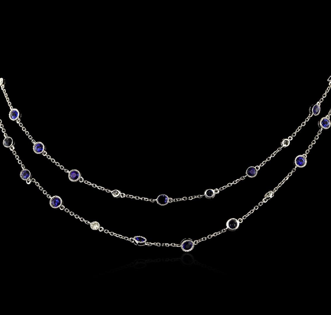 One electronically tested 18KT white gold combination cast & assembled diamonds by the yard necklace with a lobster claw clasp with a bright polish with milgrain detailing finish. The featured ladies' necklace is 32 inches in length with a 1.4 millimeter diamond cut cable link. Trademark is MICHA. Identified with markings of "18K 750". Condition is new, good workmanship. Containing: Thirty bezel set round brilliant cut natural blue sapphires, measuring 3.20 - 3.15 x 2.08 mm, approximate total weight of 5.05ct., clarity is eye clean, type II, medium, moderately strong, bluish violet color, (GIA bV 5/4), cut is very good. Colored gemstones are presumed to have been subjected to commonly used enhancement processes. Graded in the setting. Fourteen bezel set round brilliant cut diamonds, measuring 2.60 - 2.50 x 1.56mm (depth est.) approximate total weight of 14 Stones = 0.87ct. Graded in the setting. Clarity: VS-2 to SI-1. Color: H - I. Cut Very Good. Total Weight of Colored Stones 5.05ct. Total Weight of Diamonds 0.87ct. Total Weight of Necklace 15.00gm. GAS Appraised at $9,460.00.