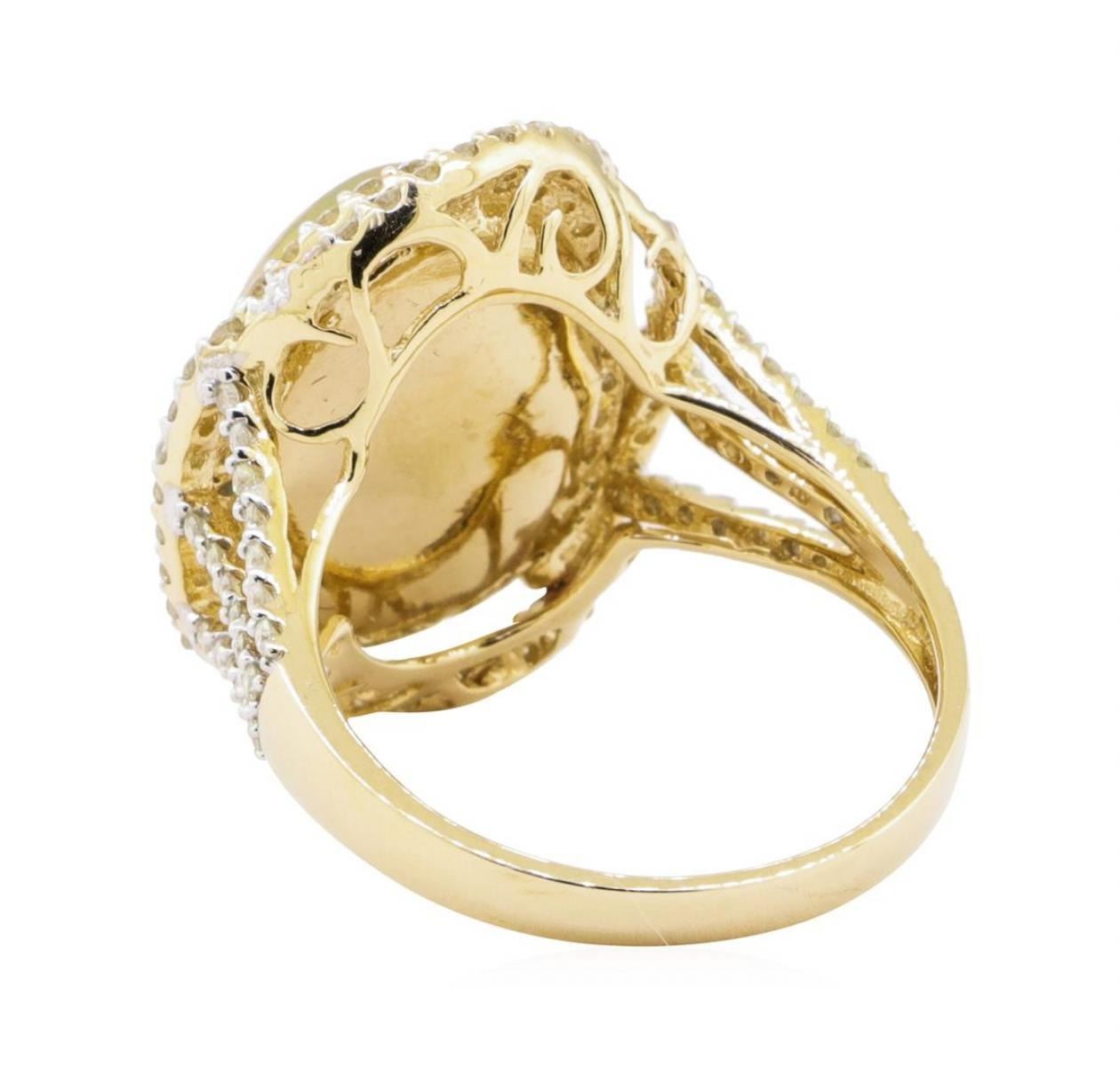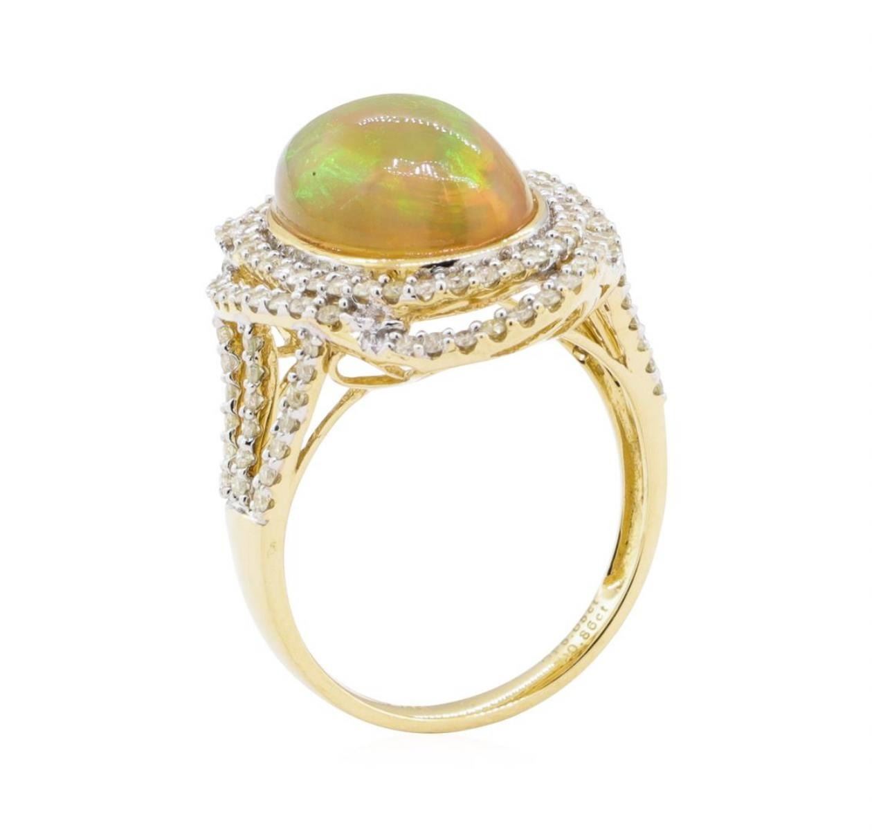 One ladies 14k yellow gold Diamond Ring weighing approx. 7.30 grams. Containing: One Oval Cabochon Opal weighing approx. 5.05 carat and l 12 Round Brilliant cut Diamonds total Weight approx. 0486 carat Gem Type:OpalShape/cut:: Oval Cabochon Carat weight:: Approx. 5.05 carat Measurements: Approx. 14.50 x 11.00 mm Setting: Bezel set Gem Type: Diamond Shape/cut:: Round Brilliant cut Carat weight:: Total approx. 0.86 carat Color: H - J Clarity: I1 - I2 Metal Content: 14k Yellow Gold Setting: Prong set ESTIMATED RETAIL REPLACEMENT VALUE: $5, 091.00 US